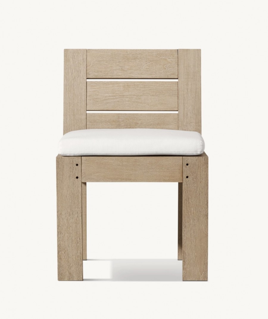 Astra Side Chair / Generous seating proportions / Solid hand crafted premium, sustainable real teak frame for heavy contract use all year round outdoors / Well weighted frame / Available in weathered teak or natural teak / On nylon glides / Square back with 2 horizontal slats for added detail / Removable premium quick dry cushions with quick drying foam specifically engineered to drain water rapidly / Cushions available in a wide variety of performance outdoor fabric colours with fade protection / Cushion zip with resist corrosion properties / Upcharge for outdoor covers / Ideal for all high-end outdoor dining areas for hotels and restaurants, country clubs and retail.