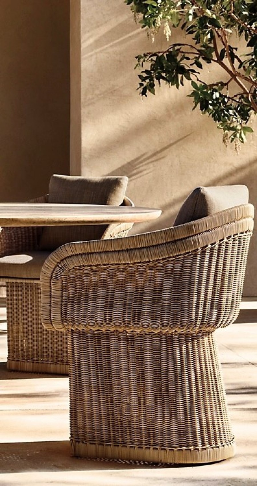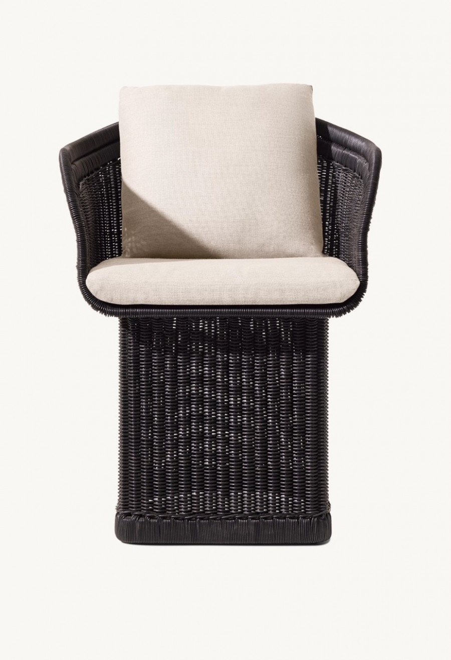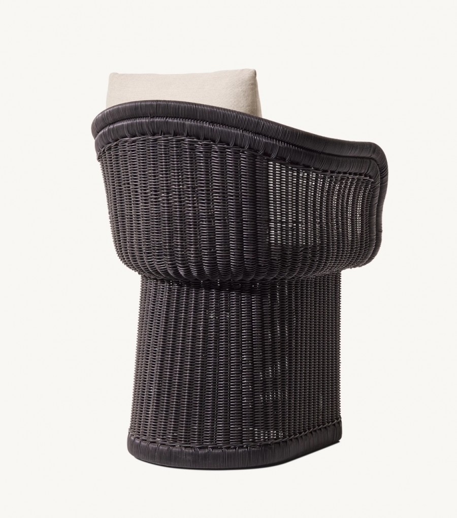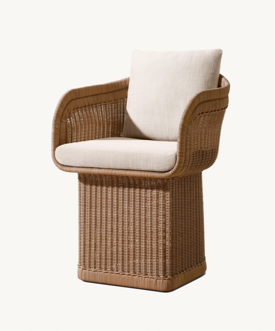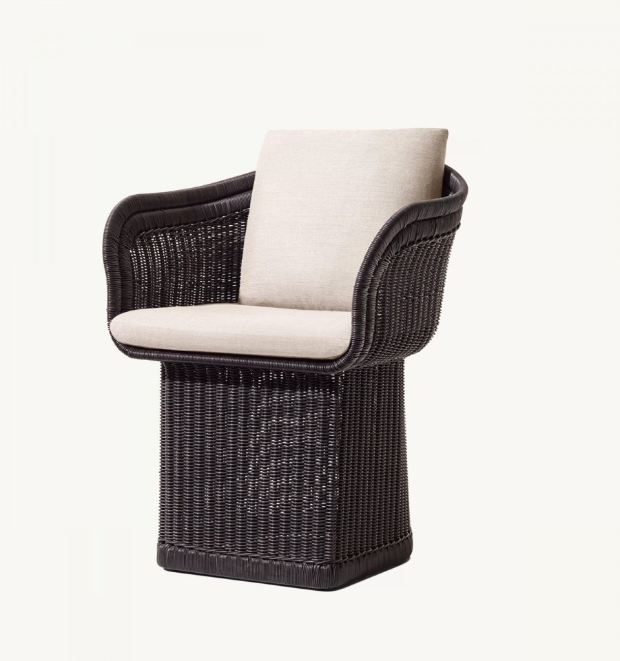 Dominica Dining Armchair / Handwoven lattice of all-weather resin wicker wrapped around aluminum frame / High-density wicker available in three color options / Wicker resists fading, cracking, tearing and UV damage / Premium quick-dry removable seat and back cushions with reticulated foam core and mesh bottom panel allowing for rapid water drainage and air circulation / Quick-dry foam wrapped cushions with poly-fibre / Cushions come in a wide choice of color options with easy-care fibres that resist stains, spills, fading and mildew / Cushions with corrosion resist zips / Upcharge for outdoor covers / Ideal for all outdoor dining applications including restaurants, hotels and country clubs.