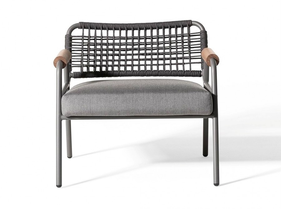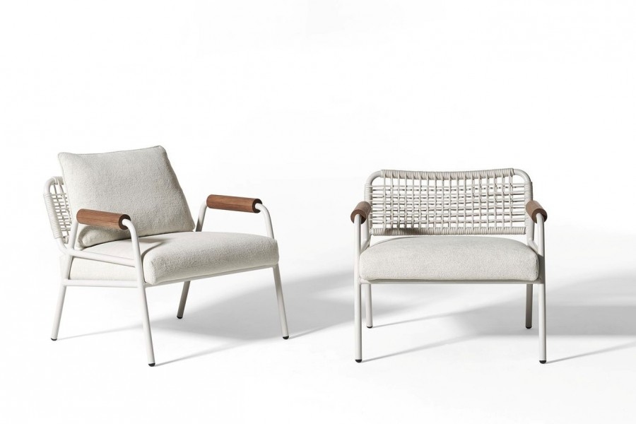 Edgewater Lounge Armchair / Integrated arms with teak round arm caps / Round tubular fully welded aluminum frame in a choice of painted colour finishes / On nylon glides / Removable seat cushion in a wide choice of outdoor fabrics available / Upcharge for additional back scatter cushion for added comfort / Ropes on back for added detail in a wide choice of colour finishes / Extremely comfortable / High quality cushions with quick dry foam / Ideal for all outdoor lounge areas and hotel balconies.