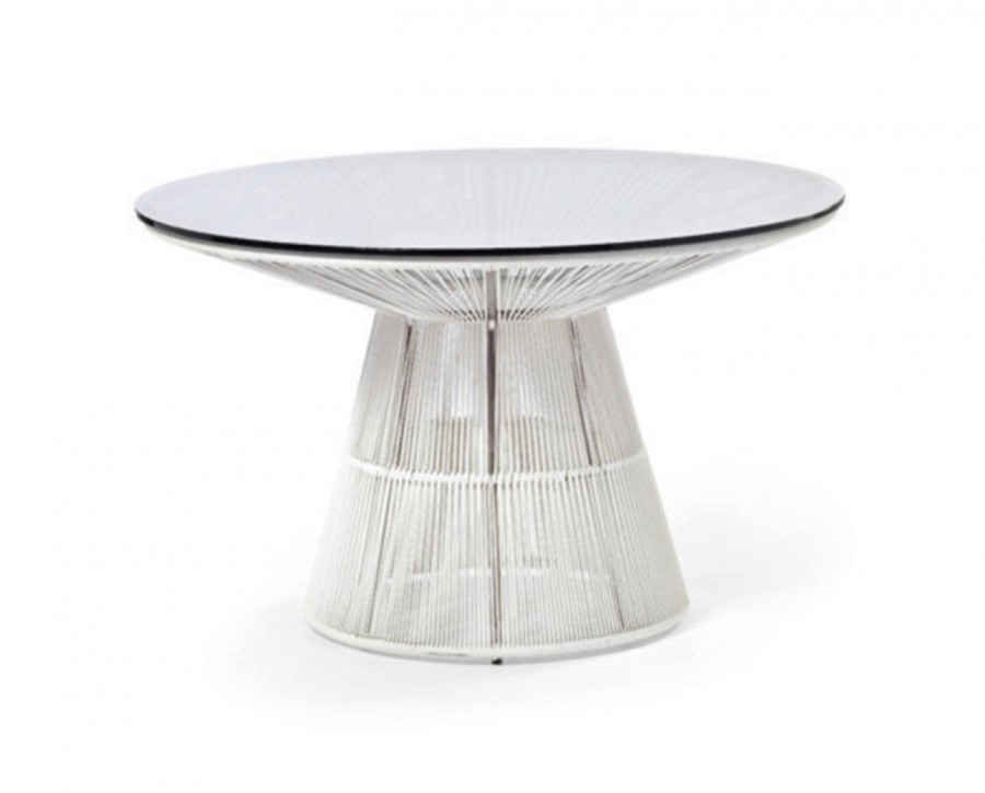 Elysee Dining Table / Round Aluminum Tube Frame available in a wide choice of painted finishes for customers individual needs / Clear shatter-proof toughened glass top with polished edge / Available in various diameters / Custom sizes on request / Available in a wide choice of rope colour options / Ropes cover base / Upcharge for outdoor covers / Ideal for all high-end outdoor dining areas for hotels and restaurants, country clubs and retail.