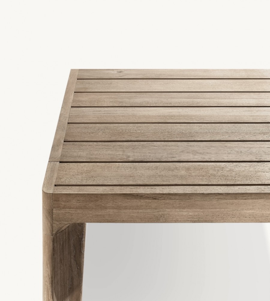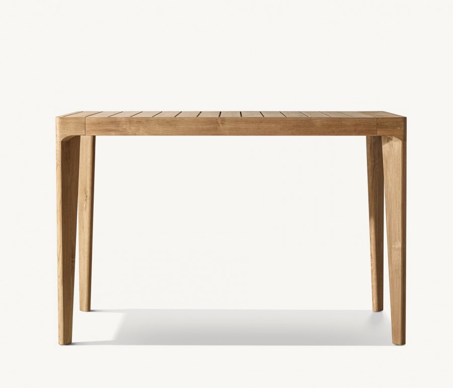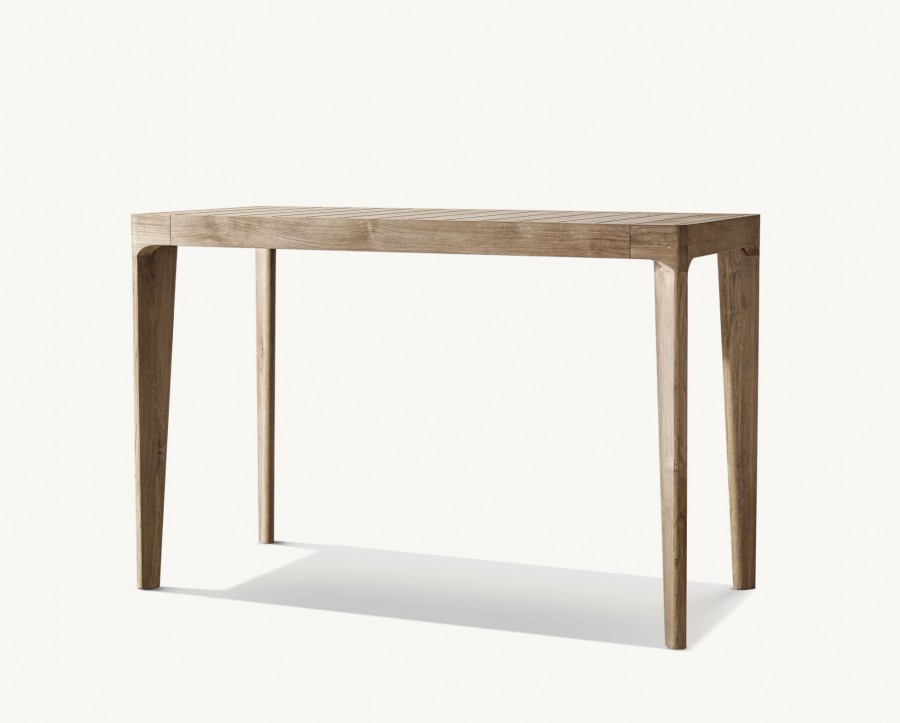 Hibiscus Bar Table / Solid hand crafted premium, sustainable real teak frame for all year round outdoor use / Parallel slated top for drainage / Available in weathered teak or natural teak / Works in conjunction with all Hibiscus stools (counter/bar) / Upcharge for outdoor covers / Ideal for all outdoor bar and dining areas.