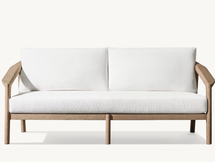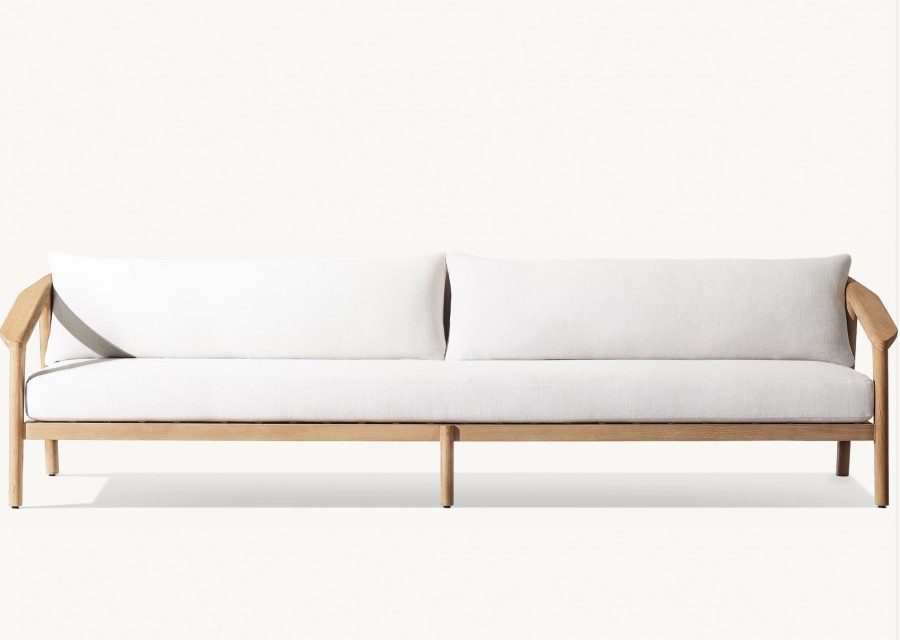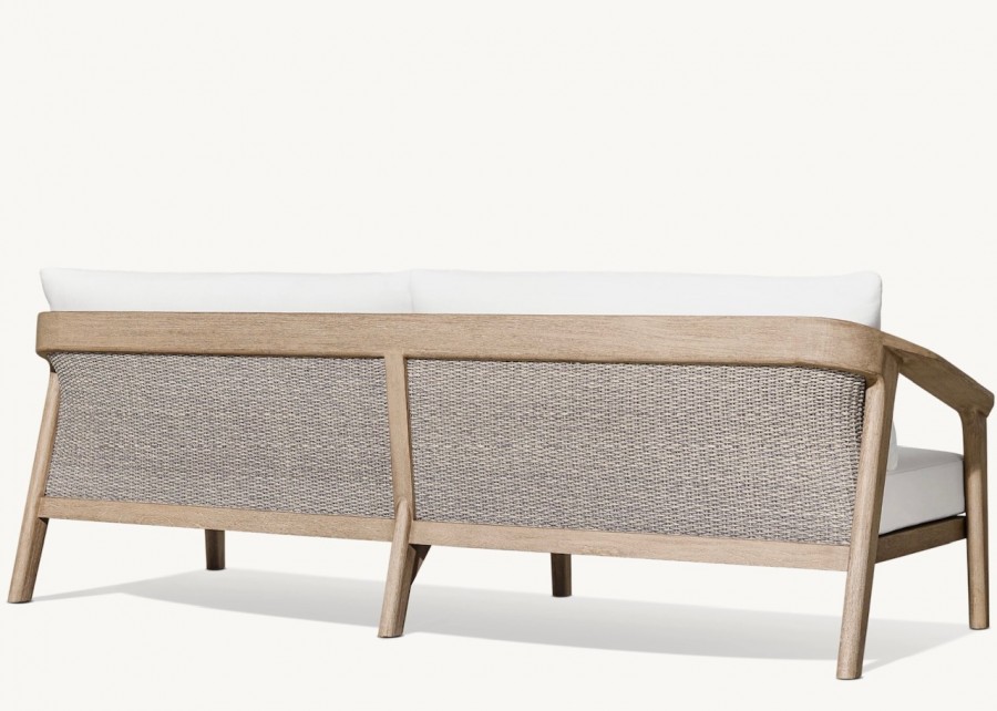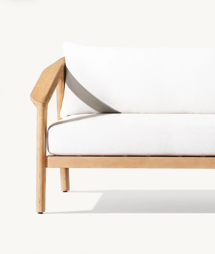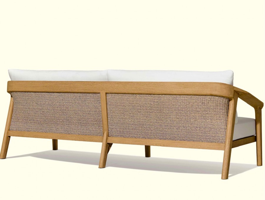 Hibiscus / Available in 3 sizes; loveseat, medium and extra large / Generous seating proportions / Solid hand crafted premium, sustainable real teak frame with integrated arms for all year round outdoor use / Available in weathered teak or natural teak / On nylon glides / All-weather wicker back panel wrapping around corners for added detail / Removable premium quick dry cushions with quick drying foam specifically engineered to drain water rapidly / Cushions available in a wide variety of performance outdoor fabric colours with fade protection / Cushion zip with resist corrosion properties / Upcharge for outdoor covers / Ideal for all high-end outdoor dining areas for hotels and restaurants, country clubs and retail.