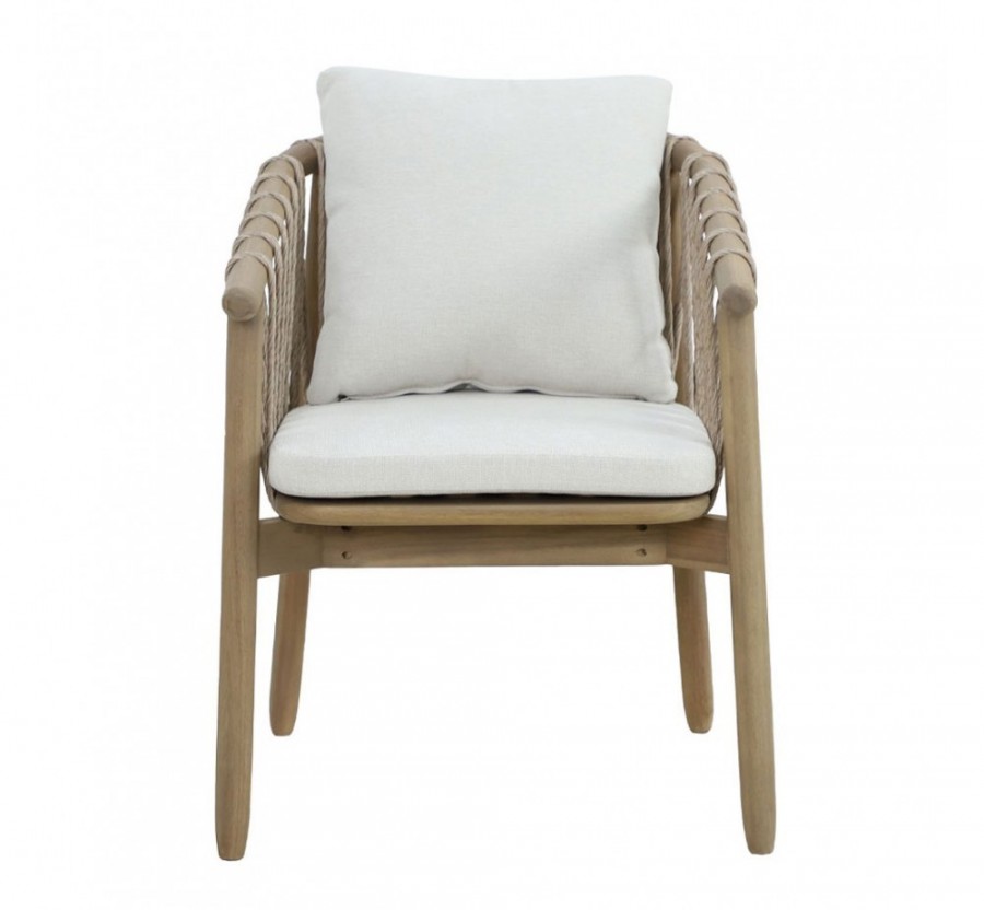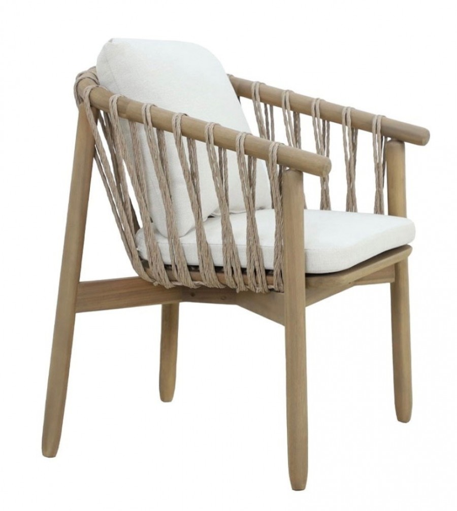Horizon Dining Chair / Teak frame available in natural or weathered teak / Tapered legs / Curved back with integrated arms / Braced under seat for heavy contract use / Slatted chair base / Removable well padded seat and back cushion in a variety of colour options / Parachute cords wrapped around arms and back for added detail in a choice of colour options / Ideal for all outside hotel dining areas, restaurants, and country clubs.