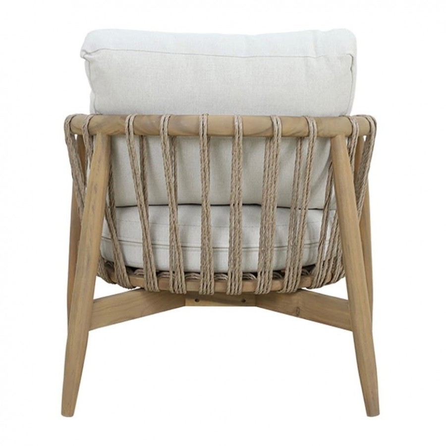 Horizon Lounge Chair / Teak frame available in natural or weathered teak / Tapered legs / Curved back with integrated arms / Braced under seat for heavy contract use / Slatted chair base / Removable well padded seat and back cushion in a variety of colour options / Parachute cords wrapped around arms and back for added detail in a choice of colour options / Ideal for all outside hotel lounge areas and country clubs.