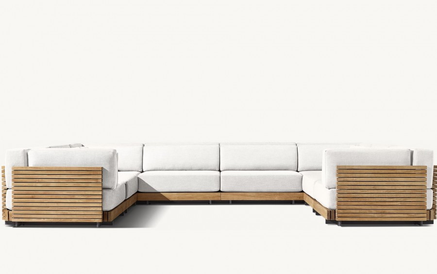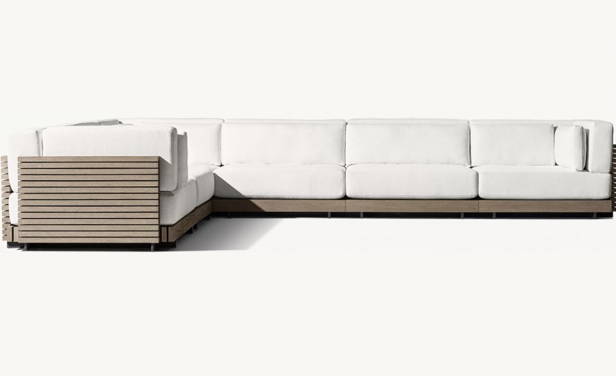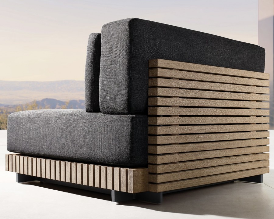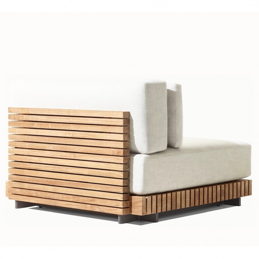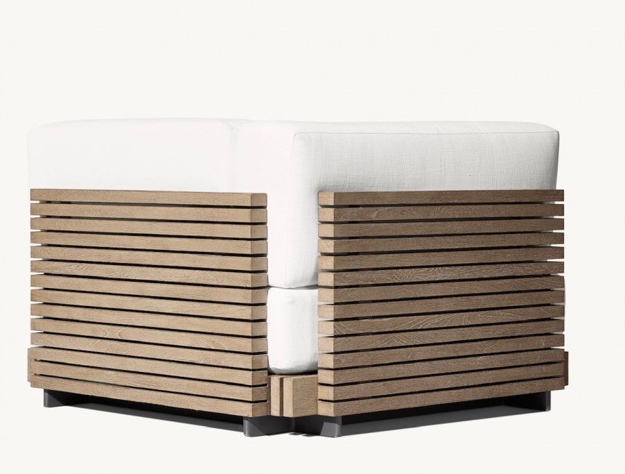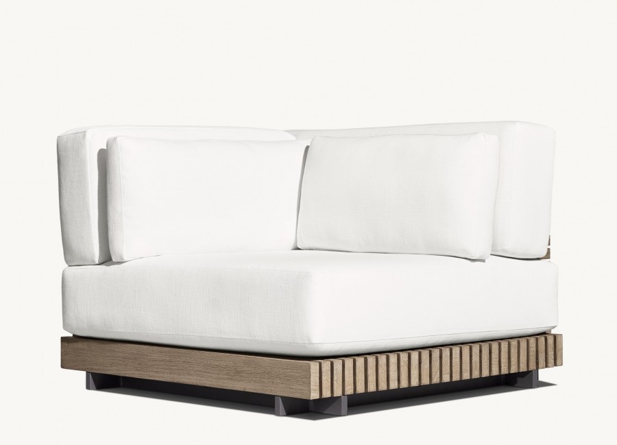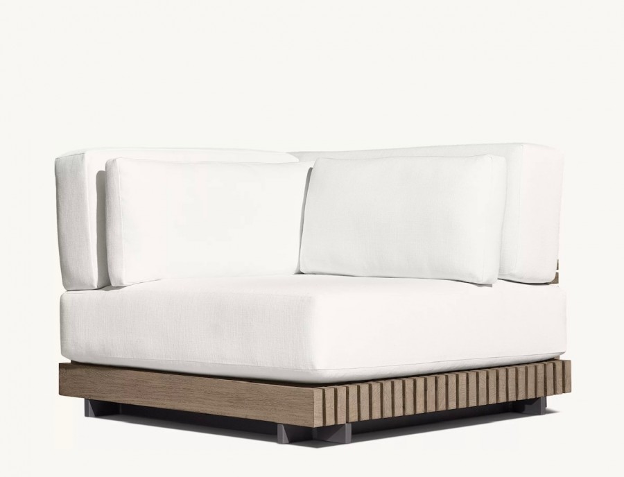 Joia Modular End/Arm Unit / Modular system also consists of footstool, straight units and corner units / Generous seating proportions / Solid hand crafted premium, sustainable real teak slatted base and back for added detail and all year round outdoor use / Available in weathered teak or natural teak / Raised glides to protect from weather elements all year round / Removable premium quick dry cushions with quick drying foam specifically engineered to drain water rapidly / Cushions available in a wide variety of performance outdoor fabric colours with fade protection / Can be configured to suit individual customers needs / Matching cocktail table available / Cushion zip with resist corrosion properties / Upcharge for outdoor covers / Ideal for all high-end outdoor lounge areas, hotels and restaurants.