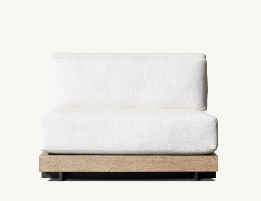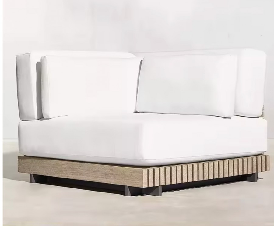 Joia Modular Straight Unit / Modular system also consists of footstool, left hand/right hand arm/corner units / Generous seating proportions / Solid hand crafted premium, sustainable real teak slatted base and back for added detail and all year round outdoor use / Available in weathered teak or natural teak / Raised glides to protect from weather elements all year round / Removable premium quick dry cushions with quick drying foam specifically engineered to drain water rapidly / Cushions available in a wide variety of performance outdoor fabric colours with fade protection / Can be configured to suit individual customers needs / Matching cocktail table available / Cushion zip with resist corrosion properties / Upcharge for outdoor covers / Ideal for all high-end outdoor lounge areas, hotels and restaurants.