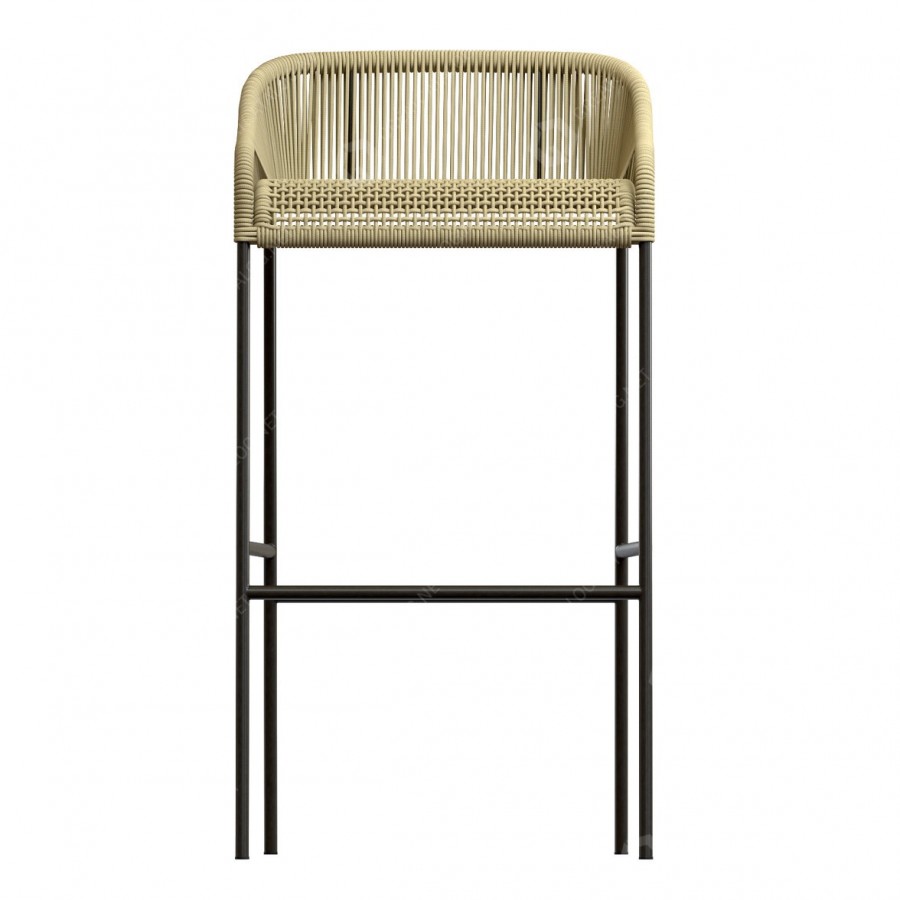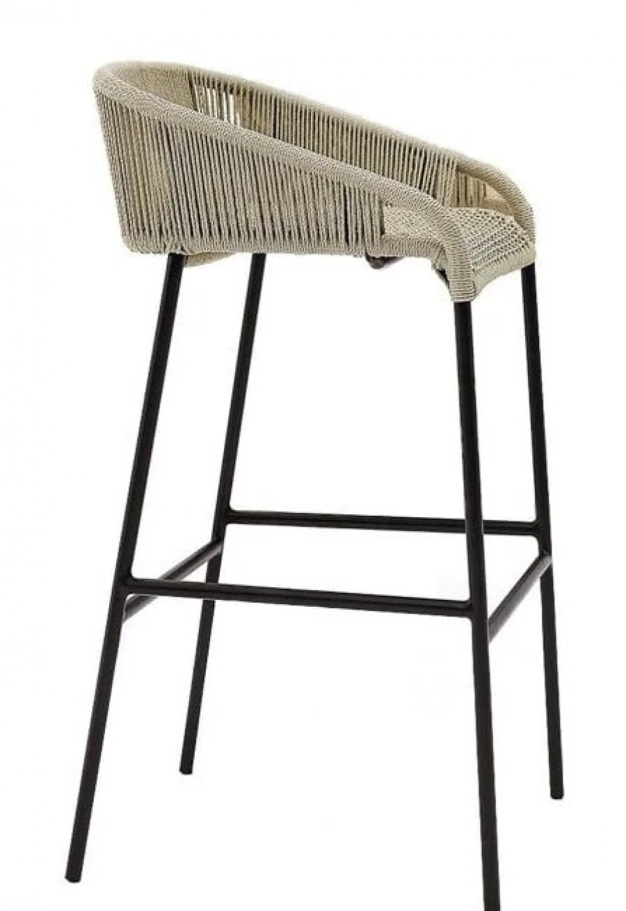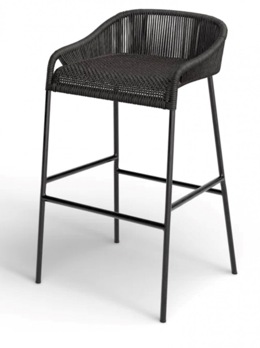 Latin Stool / Available in counter and bar height / Aluminum round tube frame / Black painted, powder coated with integrated footrest / Wicker hand finished bucket seat / UV resistant / Natural wicker or black wicker only / On nylon glides / Ideal for all bar, restaurants and hotels.