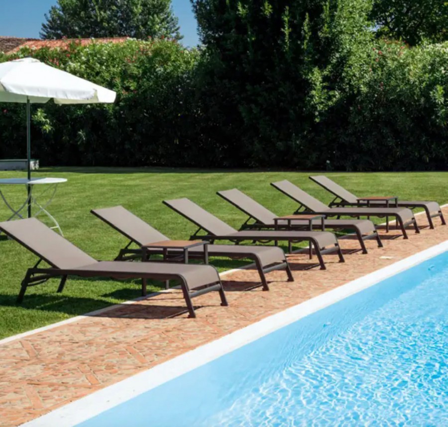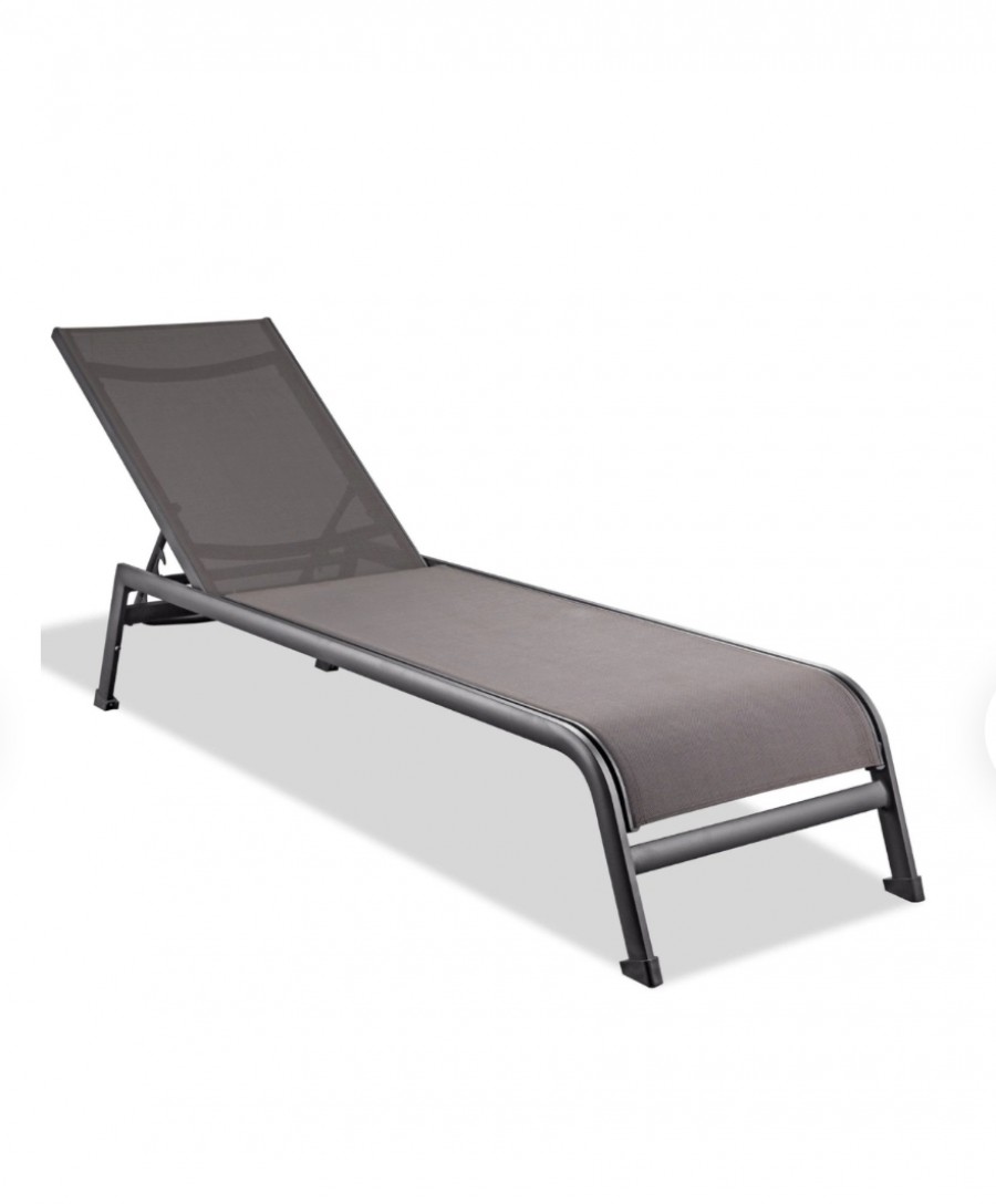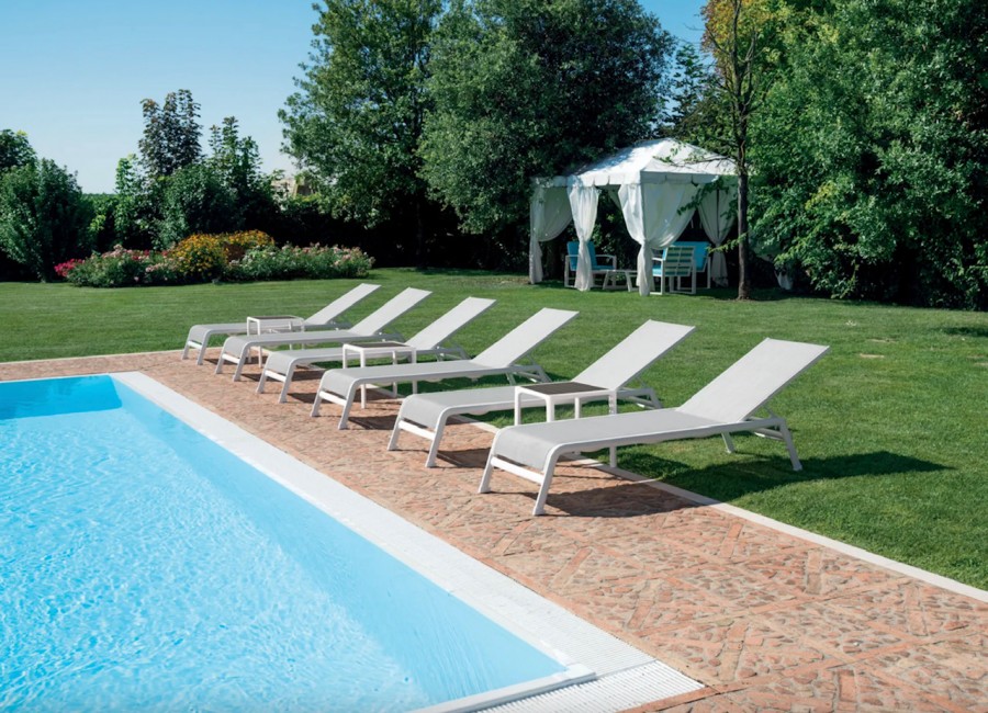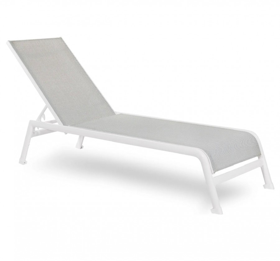 Lauderdale Sun Lounger / Aluminum powder coated frame available in white or anthracite / Nylon glides / Braced front and back for added strength / 5 position adjustable headrest / Covered in PVC plastic fabric for quick drying / Stackable 12 high / Ideal for all poolside areas, private beech clubs or large terrace areas.