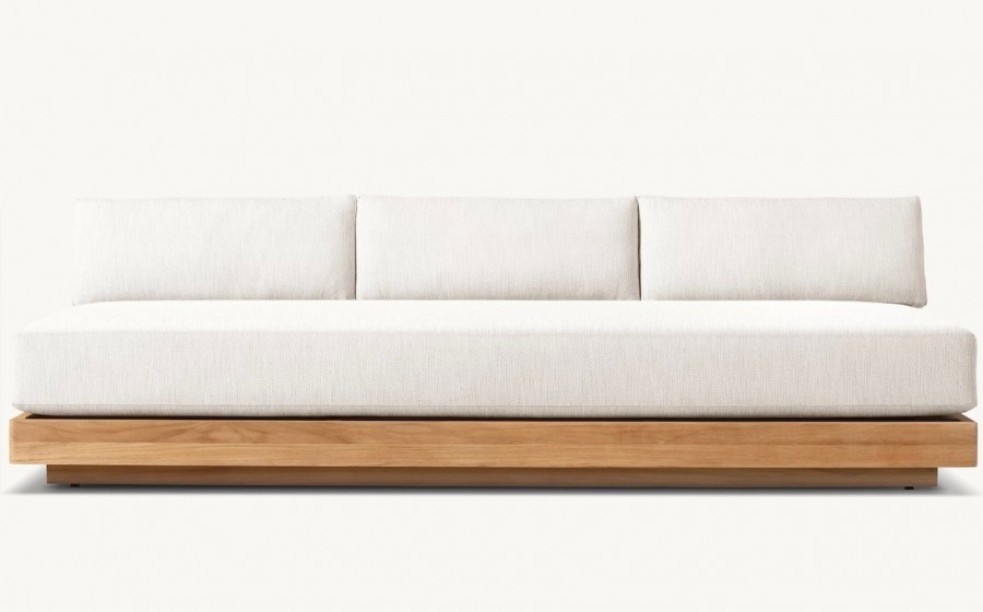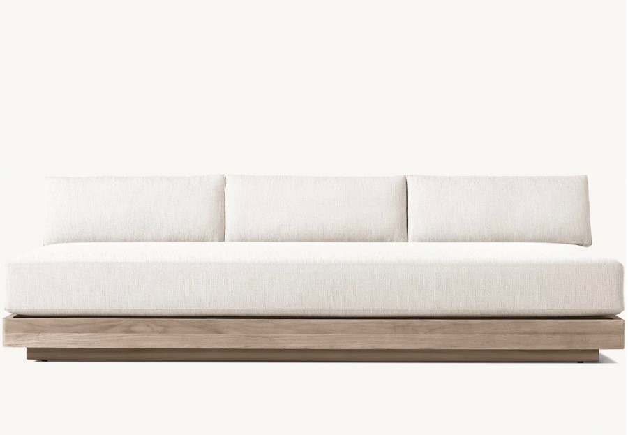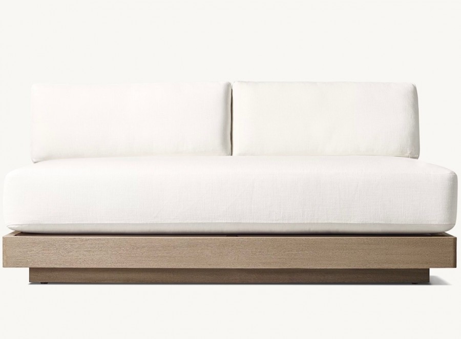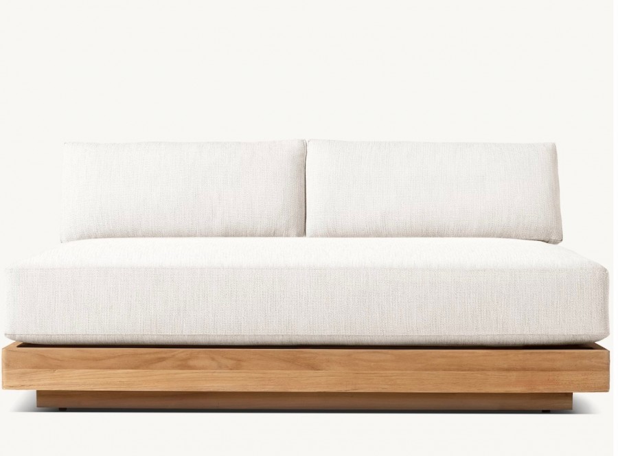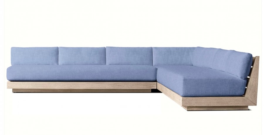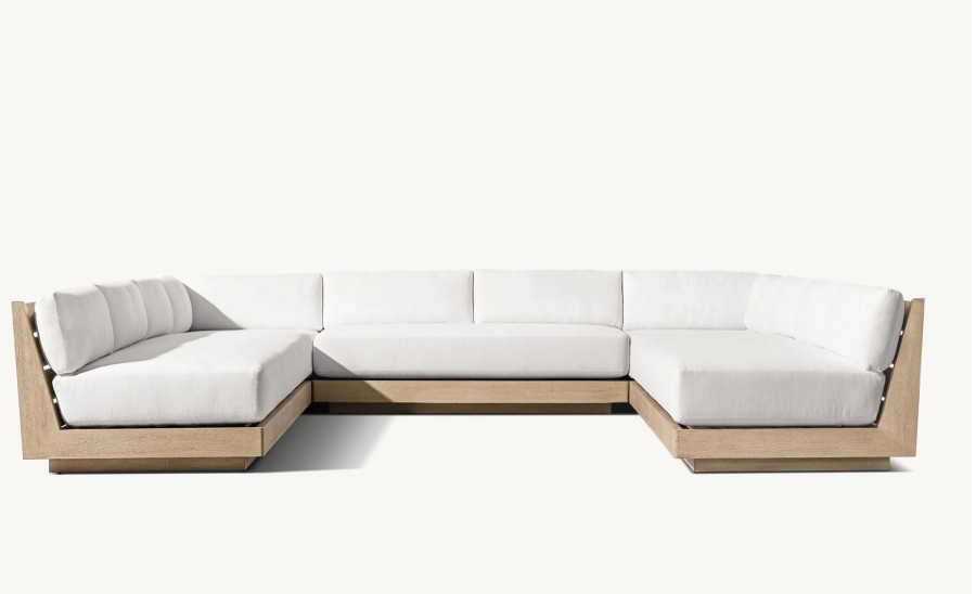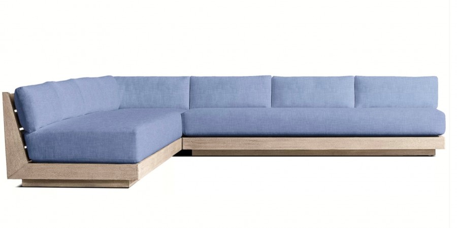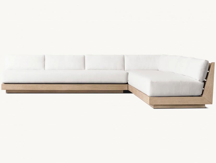 Lucia Modular Sofa / Available in three sizes / Handcrafted, sustainable harvested premium solid teak / Slatted wedge seat back and inset plinth base / Weather resistant teak ideal for all year outdoor use / Available in natural or weathered teak / Premium quick-dry cushions are engineered with an open-cell reticulated foam core and mesh bottom panel, allowing water to drain rapidly and air to circulate freely / Well padded removable seat and back cushions for added comfort / Cushions available in a wide choice of colors / Cushions have easy-care fibres that resist stains, spills, fading and mildew / Corrosion resist zips / Upcharge for heavy duty outdoor covers for all models / Modular system can be configured to your individual requirements / Ideal for all outdoor lounge areas, hotels, beach clubs, spas, and country clubs.