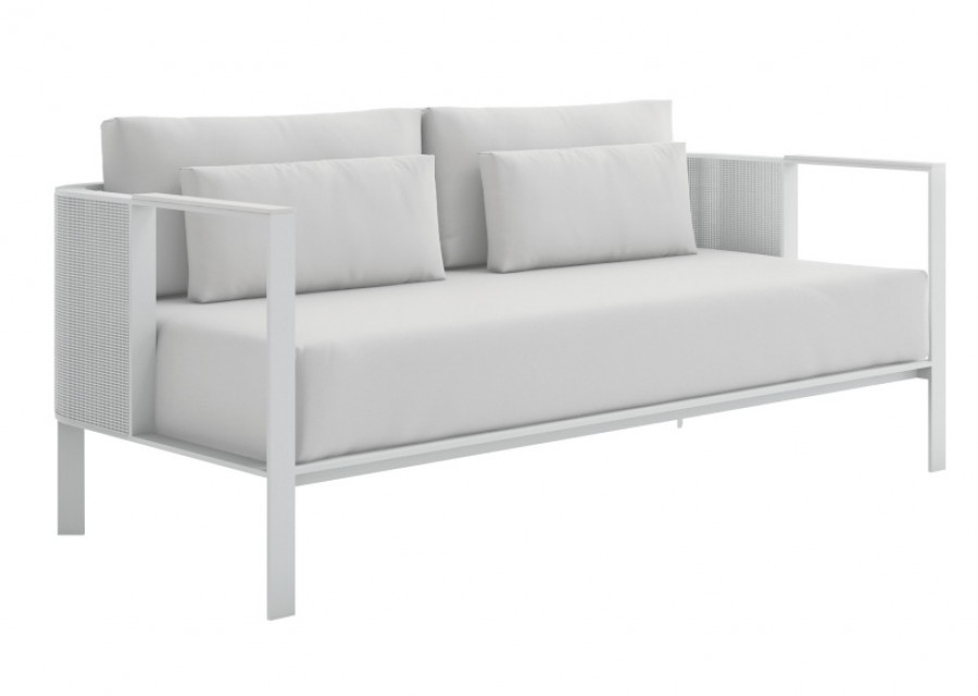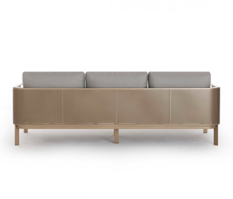 Luxe Love Seat & Three Seater Sofa / Thermo-lacquered aluminum frame with integrated arms / Generous seating proportions / Aluminum perforated sheet metal on outer back with curved corners for added detail / Well padded seat cushion and back scatter cushions in a wide choice of fabric options to suit your environment / Cushions made from polyurethane foam with water resistance, removable / Frame colour finish available in 16 colour options including satin gold to suit any outdoor environment / Ideal for all terraced areas and large open lounge areas.