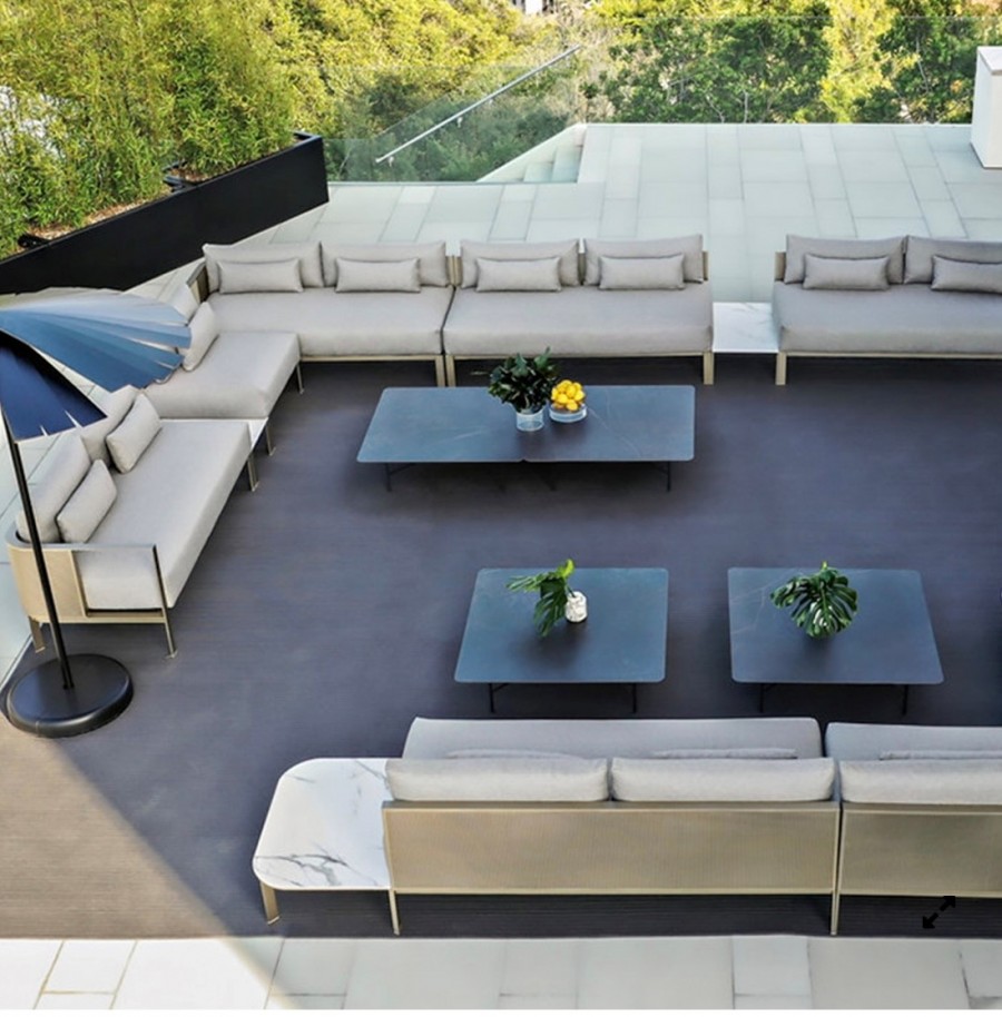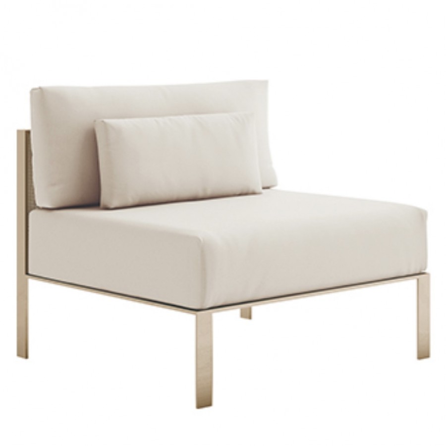 Luxe One Seater Modular (No Arms) to configure your individual outdoor seating requirements / Thermo-lacquered aluminum frame / Generous seating proportions / Aluminum perforated sheet metal on outer back / Well padded seat cushion, back cushion and bolster cushion in a wide choice of fabric options to suit your environment / Cushions made from polyurethane foam with water resistance, removable / Frame colour finish available in 16 colour options including satin gold to suit any outdoor environment / Ideal for all terraced areas and large open lounge areas.
