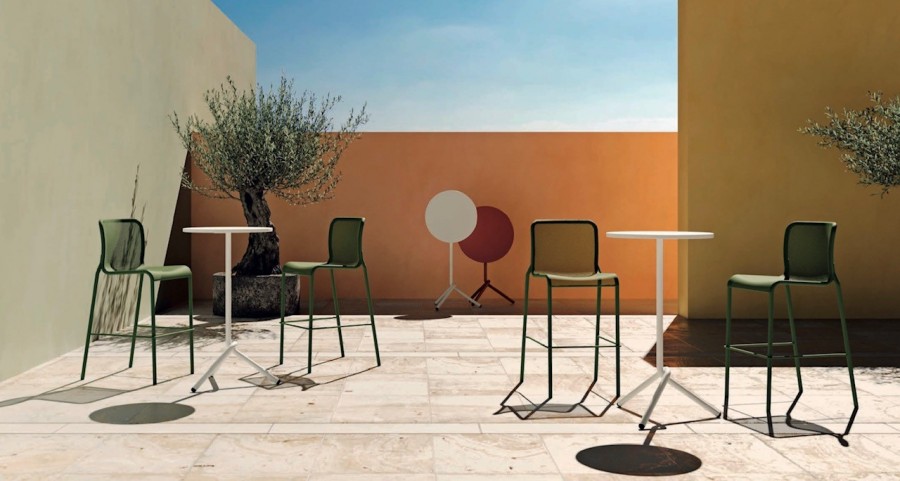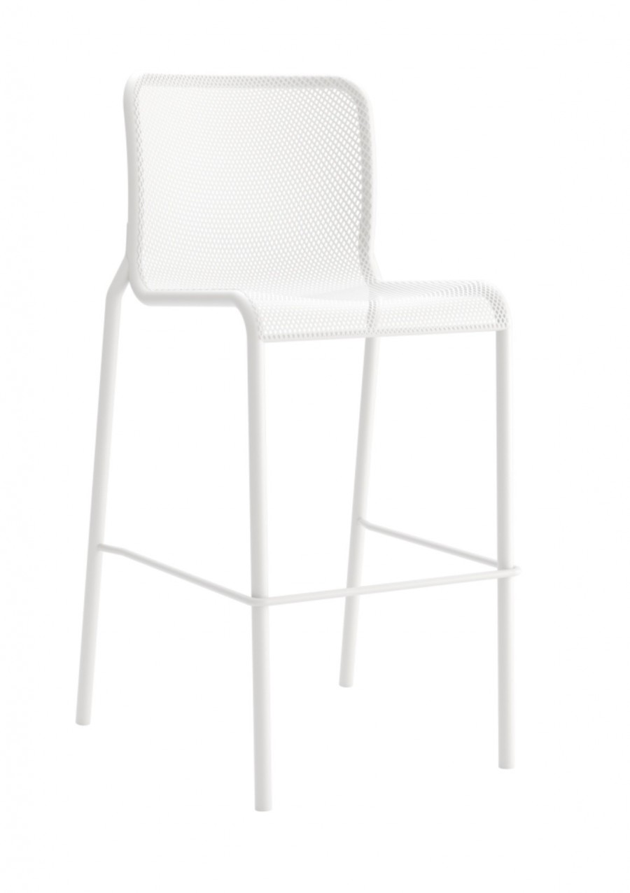 Malibu Stool, Metal Round Tubular Frame, On Nylon Glides / Integrated Foot Rest / Perforated Metal Mesh Shell / Robust Ideal For Heavy Contract Use / Various Outdoor Painted Finishes / Ideal For All Outdoor Use And Weather Environments