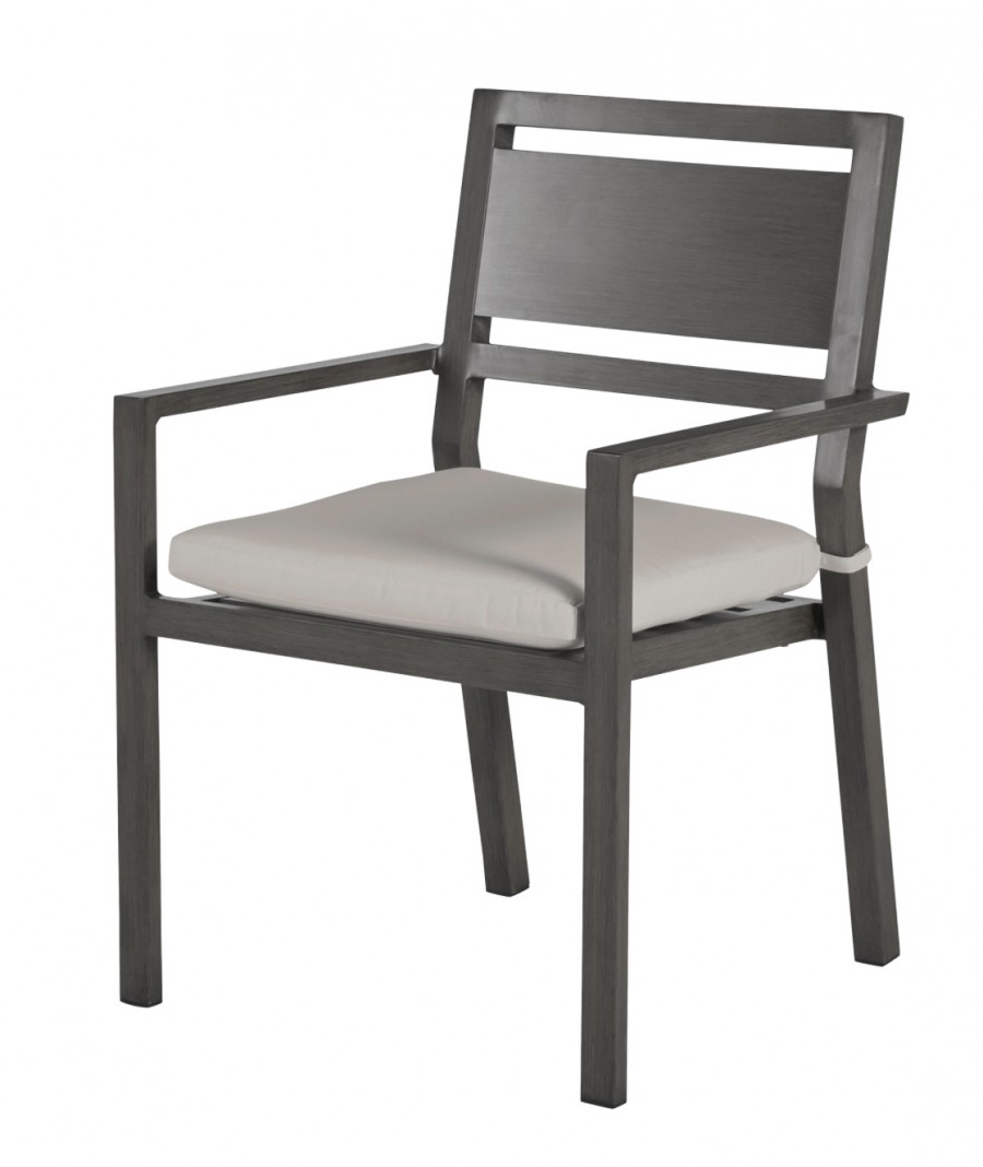Mercury Armchair / Aluminum frame in dark wood paint effect / Integrated arms / Lightweight design / Braced all round / Fully welded for heavy contract use / Slatted seat / Removable seat cushion standard in a wide choice of fabrics / Generous seating proportions / Can be left outdoors all year round / Easy to clean and does not tarnish / Upcharge for outdoor covers / Ideal for all outdoor dining applications including hotels, restaurants and retail.