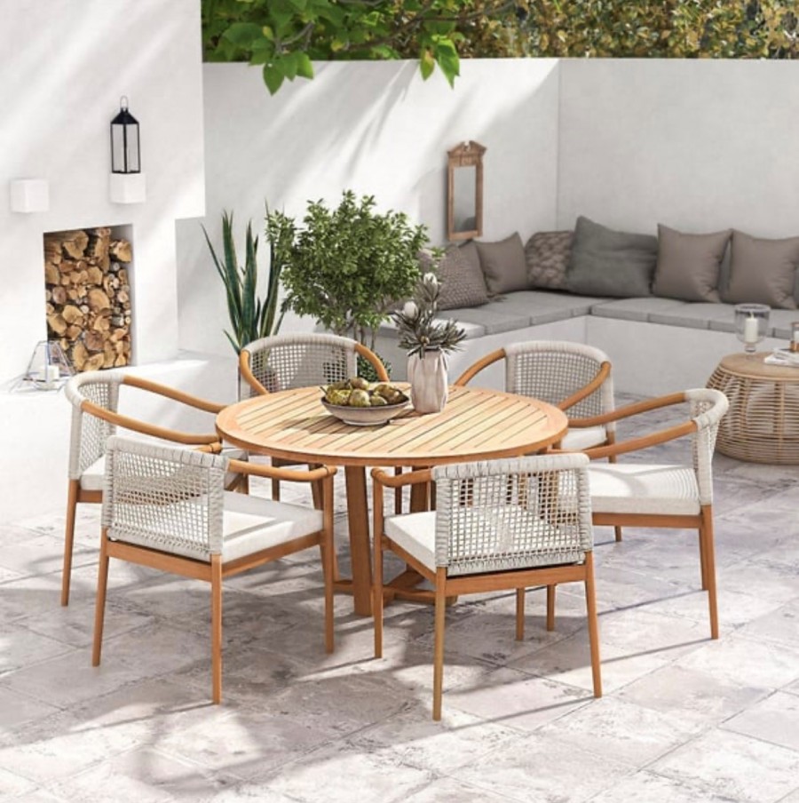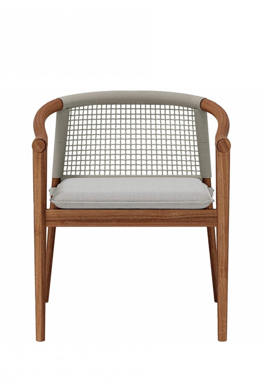 Mondrian Dining Chair / Generous seating proportions / Solid hand crafted premium, sustainable real teak frame with integrated arms and slatted seat for all year round outdoor use / Hand finished interwoven rope back for added detail in various colour finishes / On nylon glides / Curved back / Removable premium quick dry seat cushion with quick drying foam specifically engineered to drain water rapidly / Cushions available in a wide variety of performance outdoor fabric colours with fade protection / Upcharge for outdoor covers / Ideal for all high-end outdoor dining areas for hotels and restaurants, country clubs and retail.