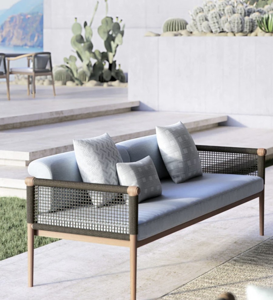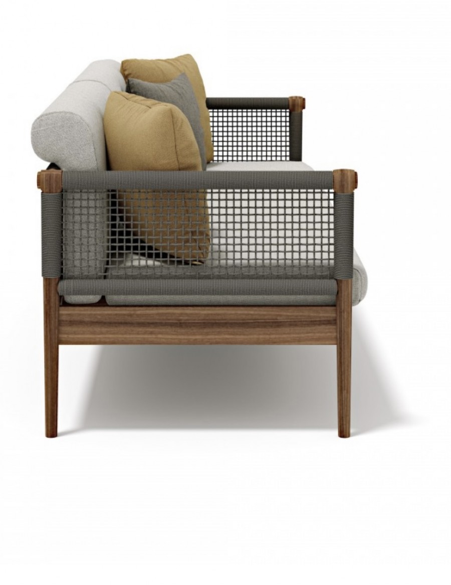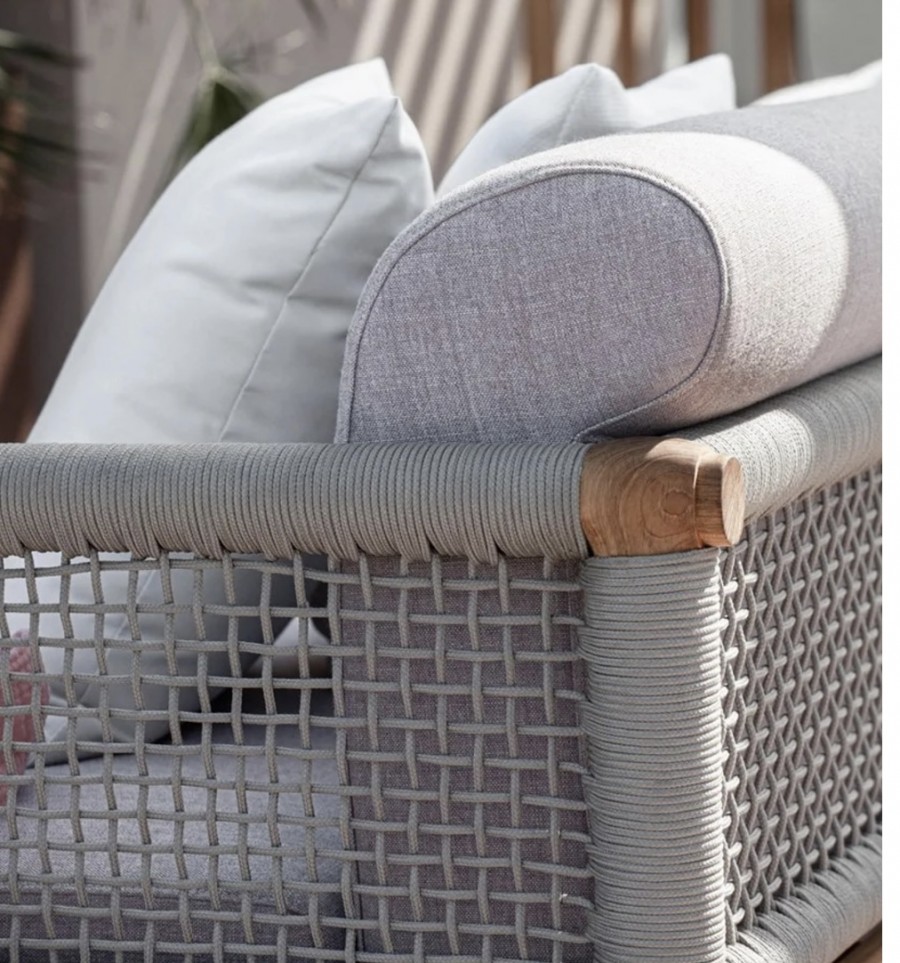 Mondrian Love Seat / Generous seating proportions / Solid hand crafted premium, sustainable real teak frame with integrated arms and slatted seat for all year round outdoor use / Hand finished interwoven rope back for added detail in various colour finishes / On nylon glides / Removable premium quick dry seat and back cushions with quick drying foam specifically engineered to drain water rapidly / Cushions available in a wide variety of performance outdoor fabric colours with fade protection / Upcharge for additional scatter cushions to give an enhanced inviting appeal / Upcharge for outdoor covers / Ideal for all high-end lounge areas for hotels and restaurants, country clubs and retail.
