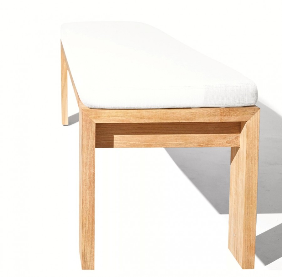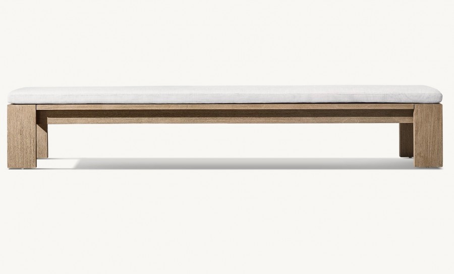 Perico Bench / Braced all round / Available in four sizes / Solid hand crafted premium, sustainable real teak frame for all year round outdoor use / On nylon glides / Available in weathered teak or natural teak / Removable premium quick dry cushions with quick drying foam specifically engineered to drain water rapidly / Cushion available in a wide variety of performance outdoor fabric colours with fade protection / Cushion zip with resist corrosion properties / Upcharge for outdoor covers / Ideal for all high-end outdoor waiting areas for hotels and restaurants, country clubs and retail.