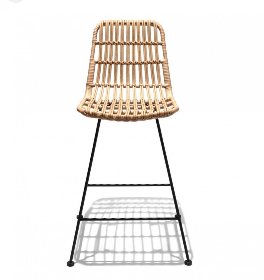 Rosetta Stool / Available in counter and bar height / Suitable for outdoor use and indoor use / Metal rodded frame / Fully welded / Powder coated in black / Poly rattan natural hand woven shell / Not stackable / Integrated footrest / Braced all round / Generous seating proportions / Ideal for all bar areas and coffee shops, restaurants and hotels.