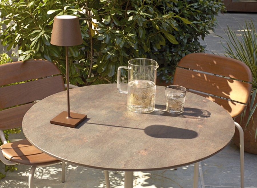 Zuma Collection: Outdoor Table / Round Tubular Frame / Cast Aluminium Base On Glides / Powder Coated in Various Finishes / Available with Round or Square Top in Various Sizes / Tops Available in Solid Colours or Marble Effect / Matching Arm Chair Available / Suitable for All Outdoor Dining Applications, Including Coffee Shops, Shopping Malls, Hotels and Restaurants