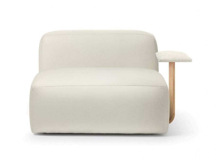 Brickell Modular System Seat / With left or right arm / Soft profile design for extreme comfort with well padded seat and back / Deep seat for added comfort / Can be upholstered in fabric, vinyl or leather / Upcharge for two-tone upholstery / On nylon glides / Arms with upholstered padded top for additional comfort and added detail / Upcharge for curved plywood fixed side table available in natural oak or moka oak / USB and electrics available on request on all models to plug in iPhone or iPad / Ideal for lobby areas, hotels, bar areas and apartments.