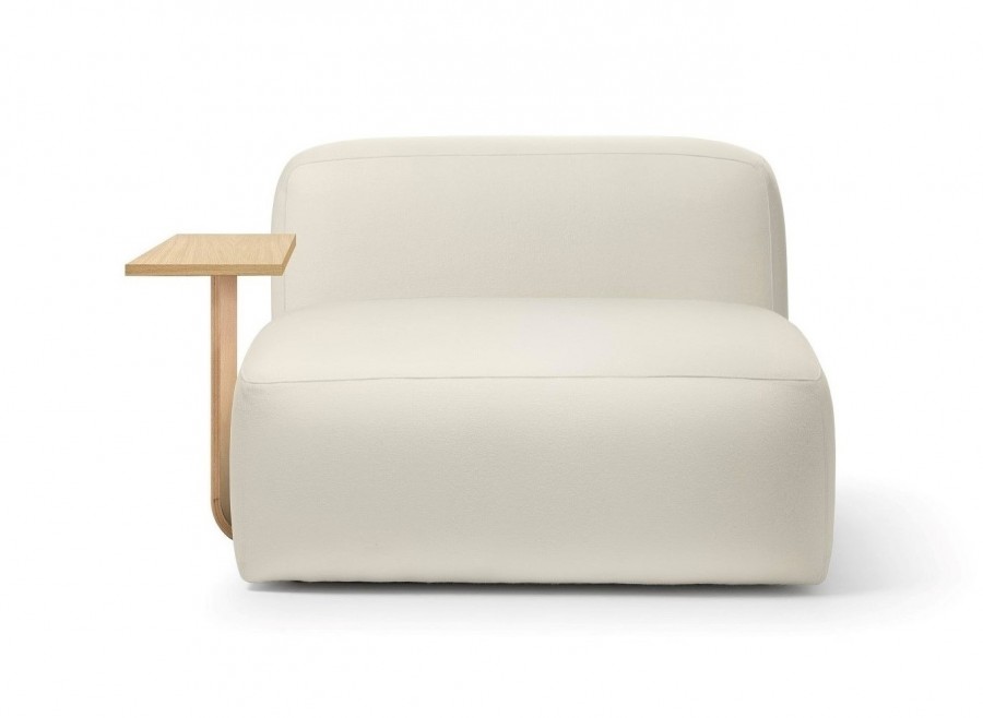Brickell Modular System / With back / Soft profile design for extreme comfort with well padded seat and back / Deep seat for added comfort / Can be upholstered in fabric, vinyl or leather / Upcharge for two-tone upholstery / On nylon glides / Upcharge for left or right curved plywood fixed side table available in natural oak or moka oak / USB and electrics available on request on all models to plug in iPhone or iPad / Ideal for lobby areas, hotels, bar areas and apartments.