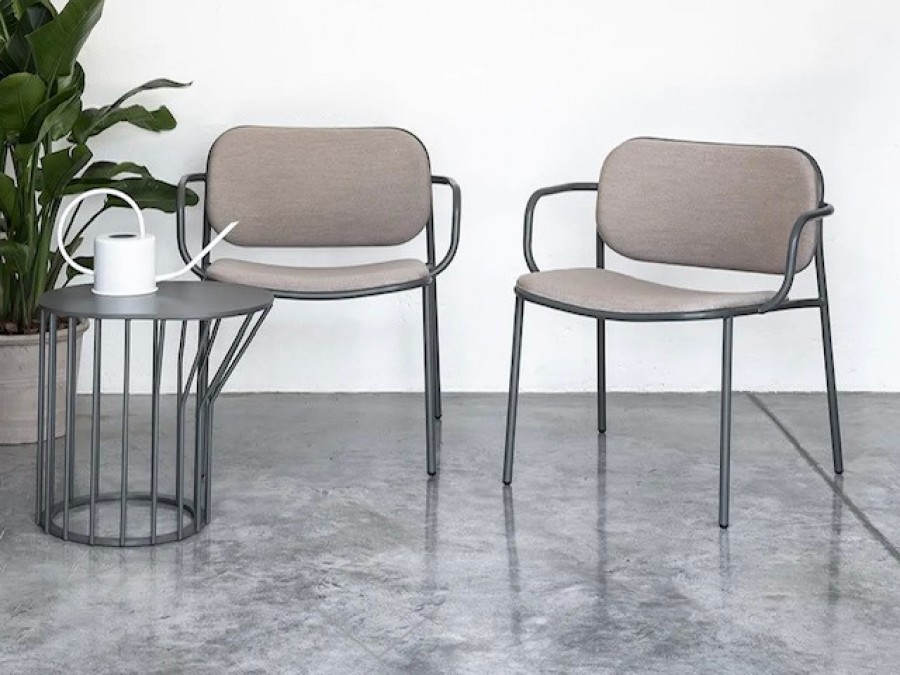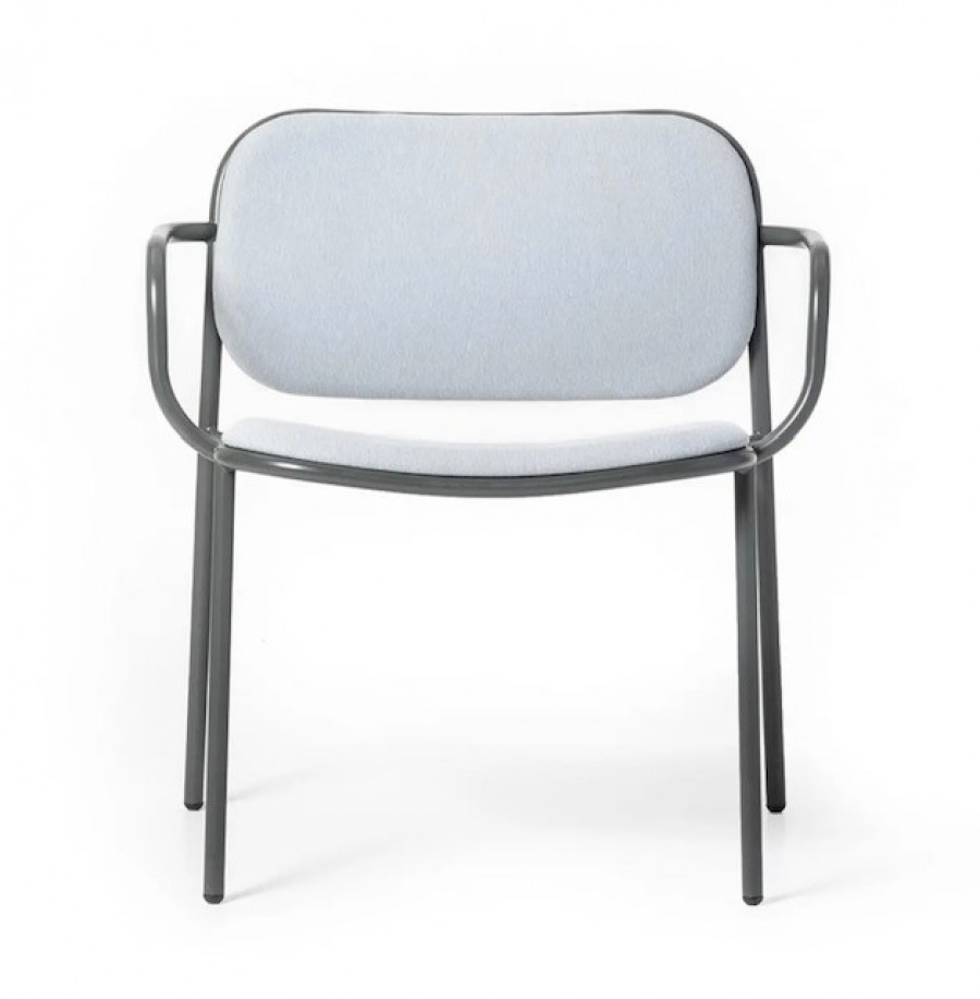 Jaeger Stacking Armchair / Round metal tubular frame and integrated arms for additional comfort / Stackable 4-5 high / On nylon glides / Available in standard painted finishes or upcharge for additional frame colour finishes including brass, chrome and black chrome / Fully welded frame for heavy duty contract use / Well padded seat and back / Can be upholstered in fabric, vinyl or leather / Generous seating proportions / Deep seat for added comfort / Ideal for hotel lobbies and meeting areas.