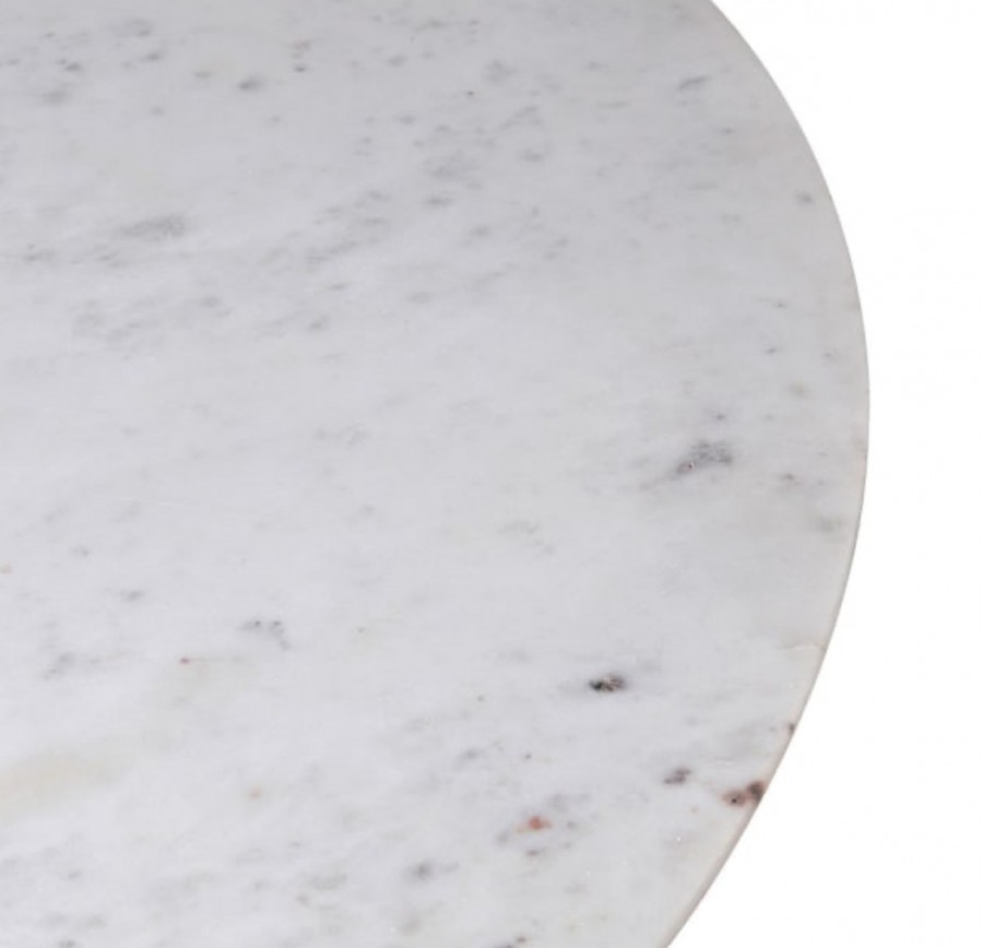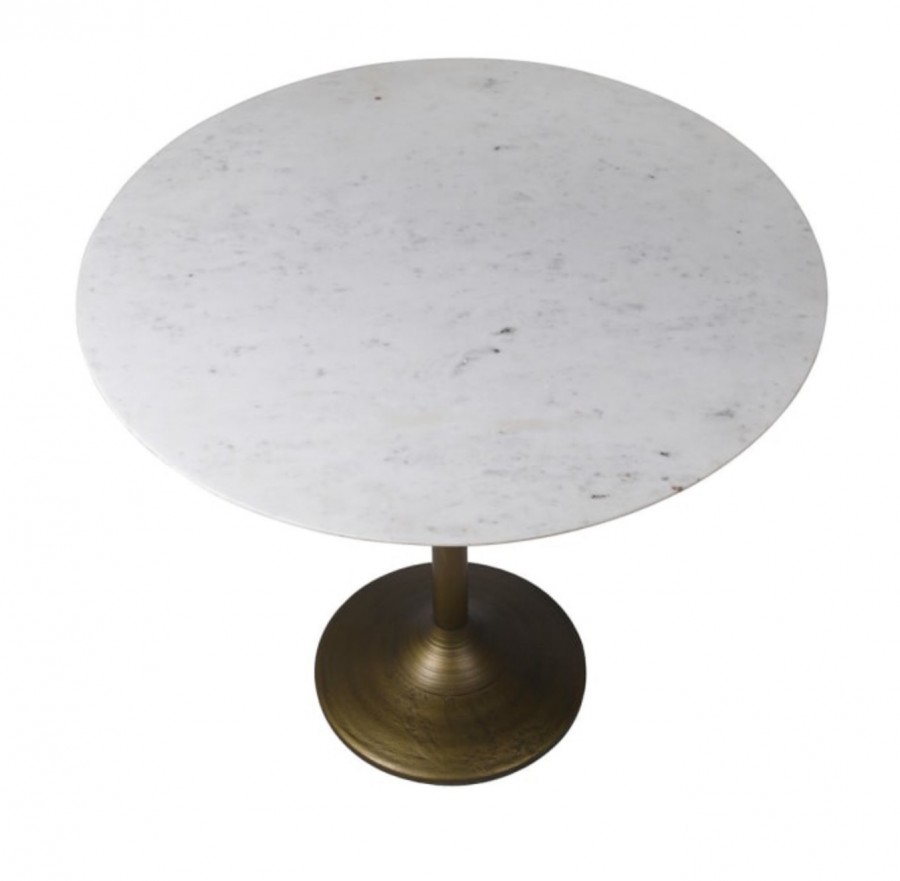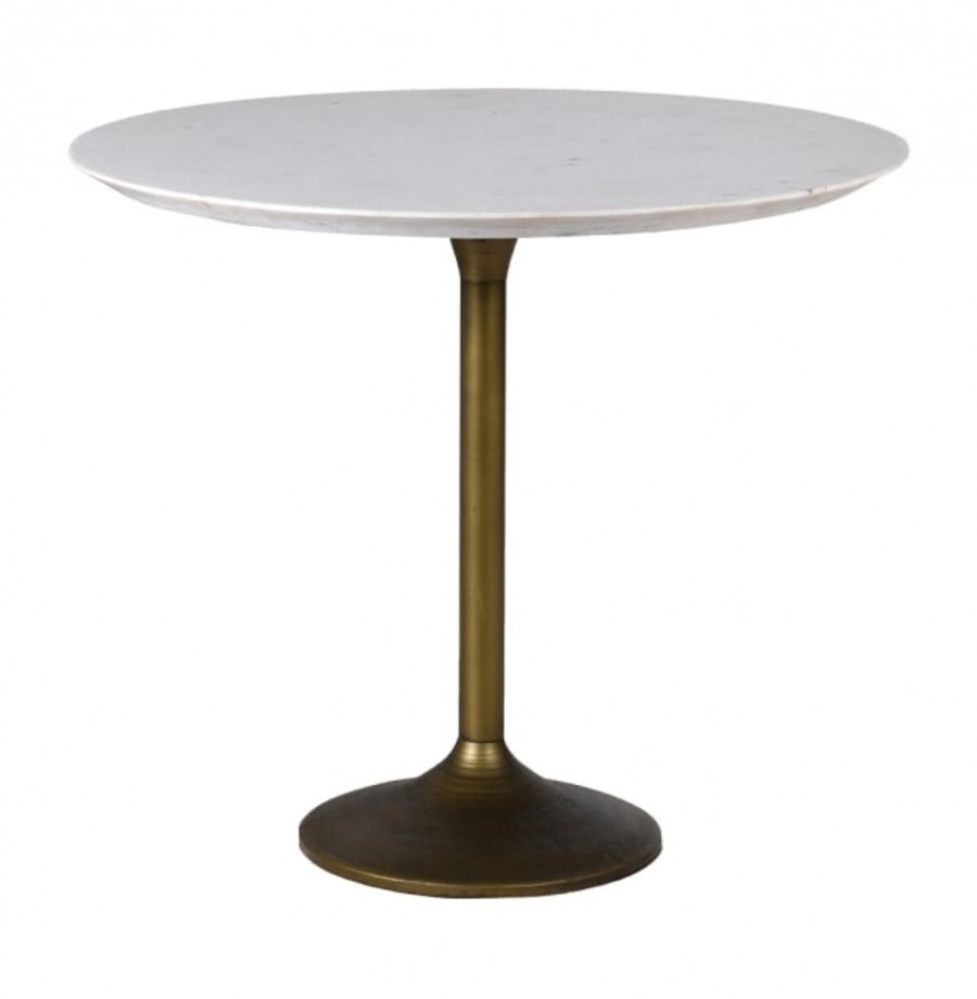 Mar Dining Table / Trumpet well-weighted brass antique finish metal base / White marble round top / Ideal for all high-end hotel for cocktail bars, dining areas and private guest room suites.