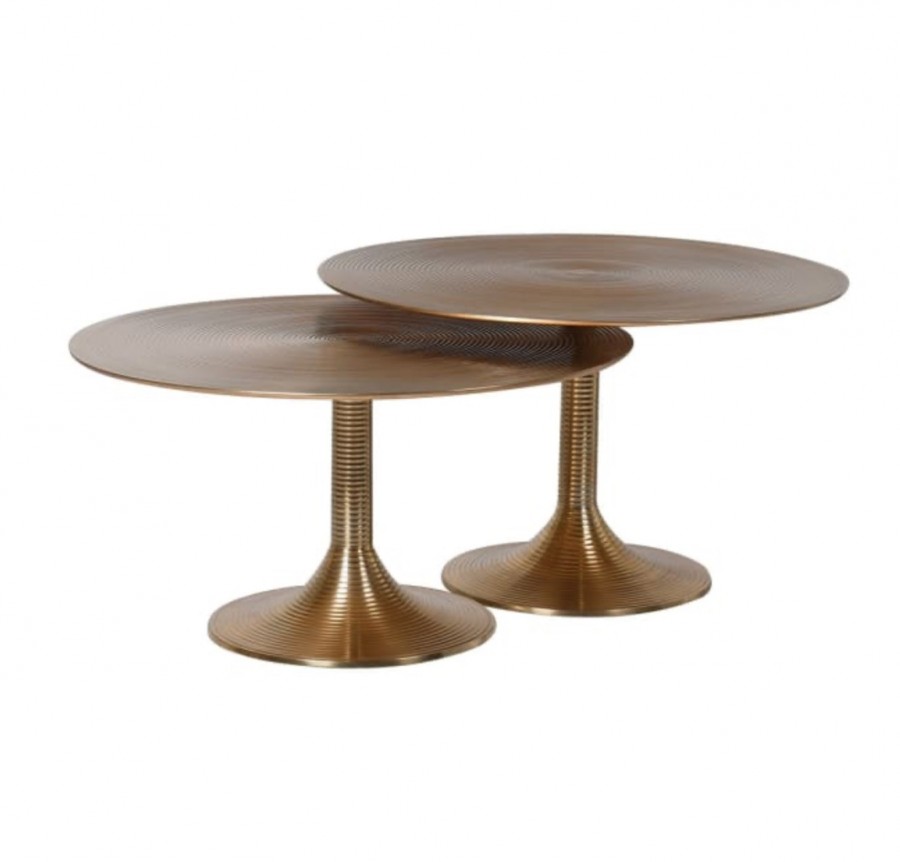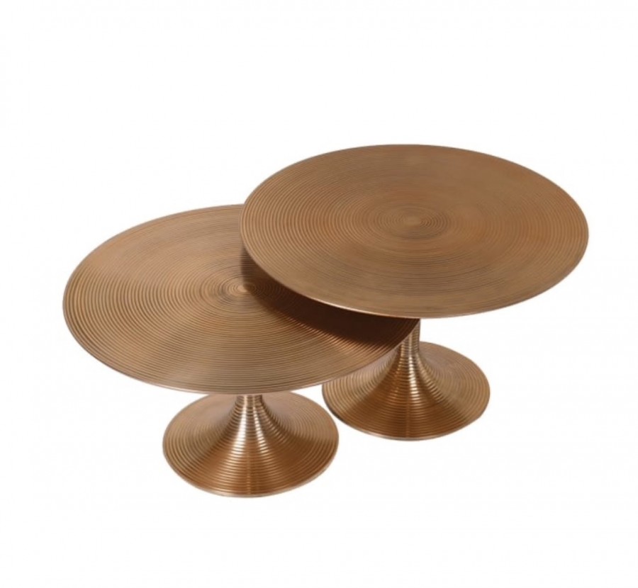 Tiffany Cocktail Table Set of 2 / In two heights / Striking unique all-over riveted finish for statement pieces/ Well-weighted trumpet metal base / / Ideal for all high-end hotel for cocktail bars, dining areas and private guest room suites.