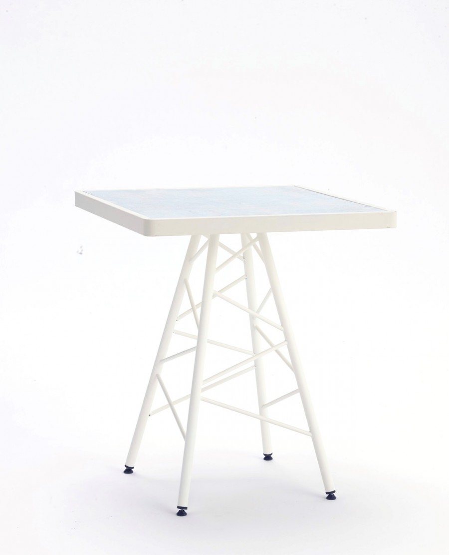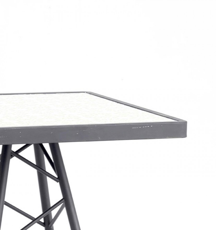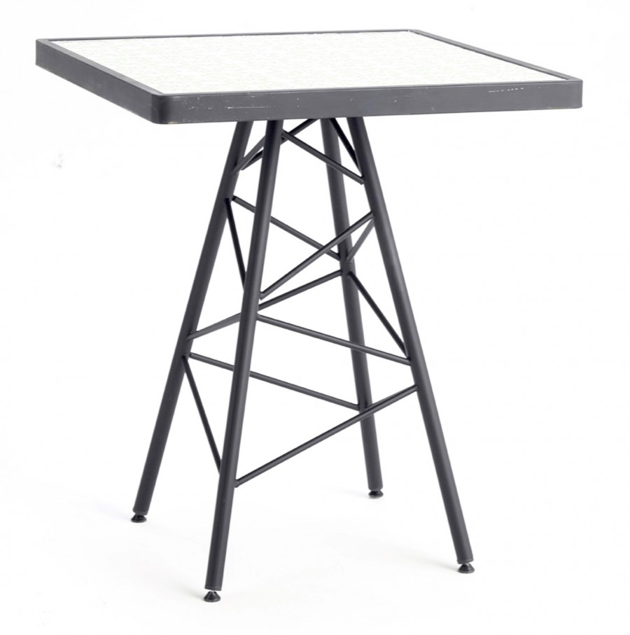 Flatiron Table / Available in dining and bar height / Black or white painted frame standard / Other colours on request / A choice of HPL laminate tops / Standard laminate top / Upcharge for thicker laminate top with framed edge for added detail to match metal frame finish / In various sizes including round or square / Fully welded frame on glides / Unique metal design with metal rodded struts in between legs for heavy duty use / Round tube steel / Ideal for all coffee shops, bar areas and hotels.
