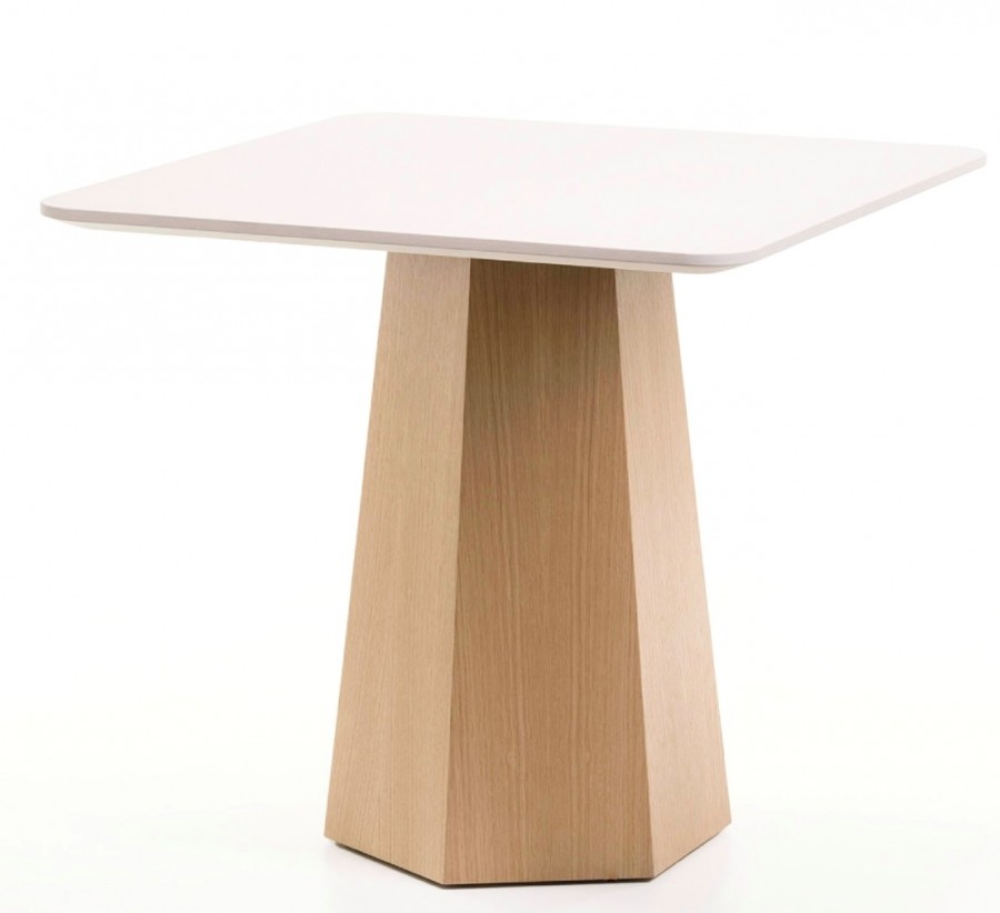 Pentagon Table / Available in side table, cocktail table, dining table, and bar table, with either round or square tops in various sizes / 1" thick tops with chamfered edge standard for added detail / MDF table tops / Solid colour tops in ceramic design with matching edge profile colour or co-ordinating top and base with tops in matching wood finishes and chamfered edges with layered MDF for added detail / Unique hexagon shape base manufactured from MDF / Square steel plate on top of base to support top for heavy contract use / Ideal for hotels, lobby areas, dining areas, retail use for display purposes, country clubs and any hospitality environments.