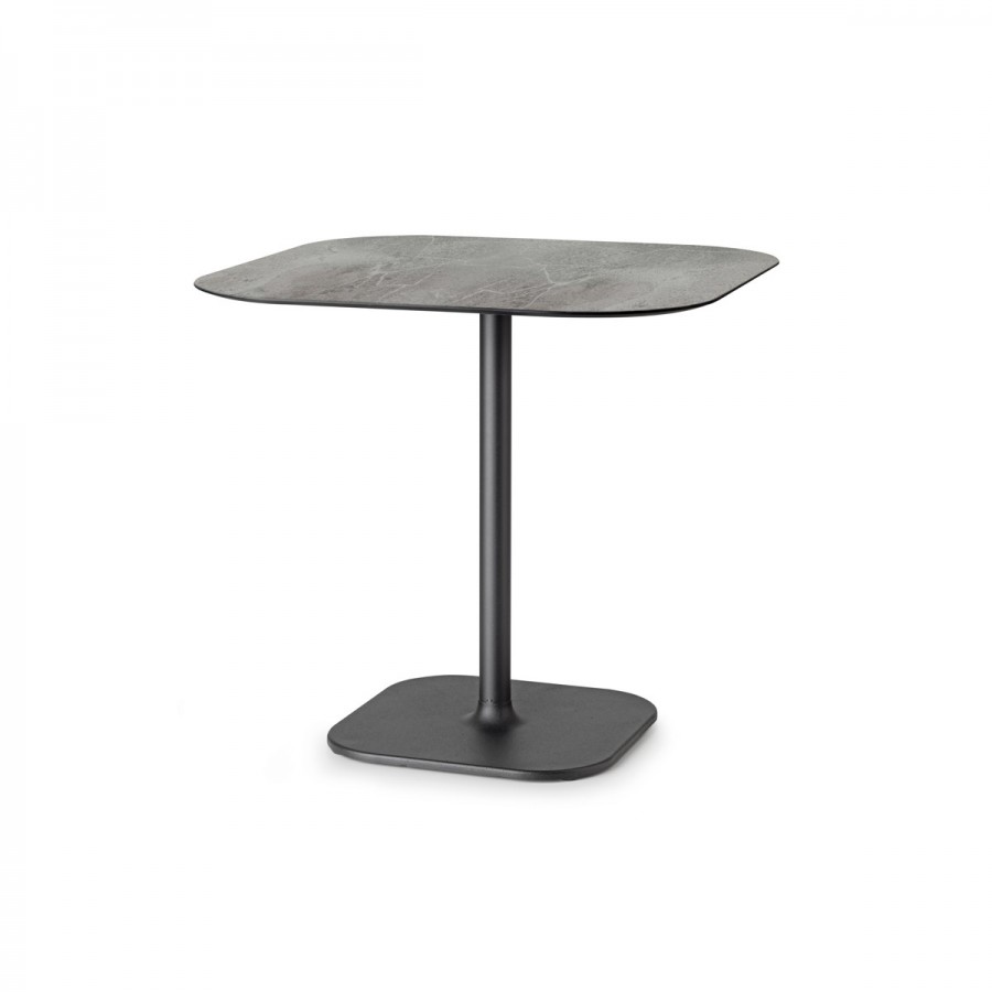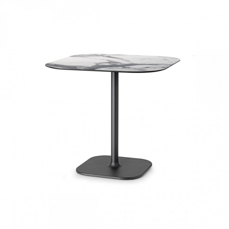 Quatro Table. Available in Dining Height or Bar Height / Various Size Tops / Round Top or Square with Round Corners / Choice of Painted Finishes on Base / Well Weighted Base / Top Available in Solid Colours or Upcharge For Marble Effect / All Tops HPL Laminate / Ideal For All Collaboration, Cafe and Dining Applications