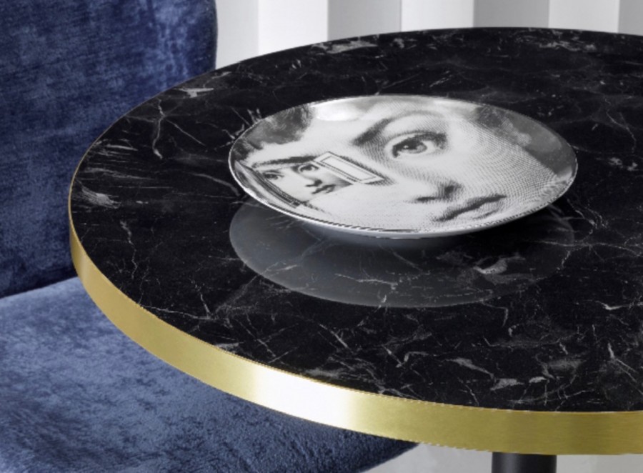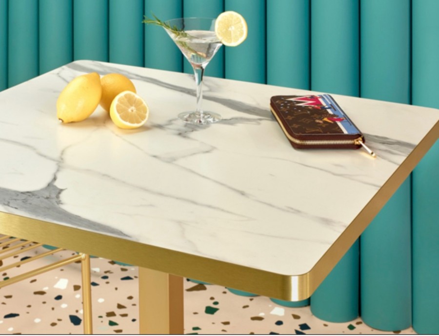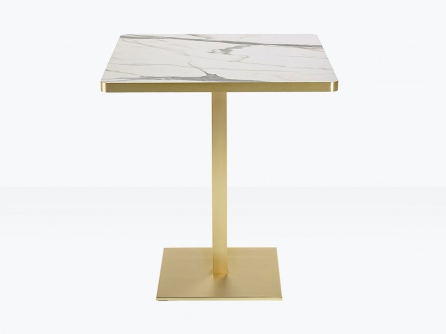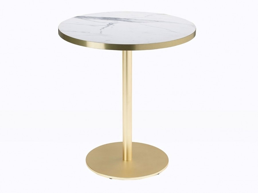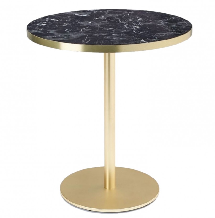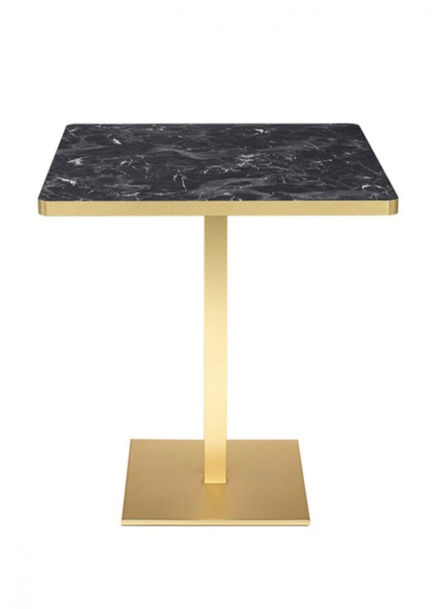 Saxony Multipurpose Table / Available in black or white marble effect laminate tops / With brass trim edge to match base / Available in square or round tops in various sizes / Well weighted metal base / Round base on round top / Square base on square top / Ideal for all dining applications including coffee shops, boutique hotels, casinos, country clubs.
