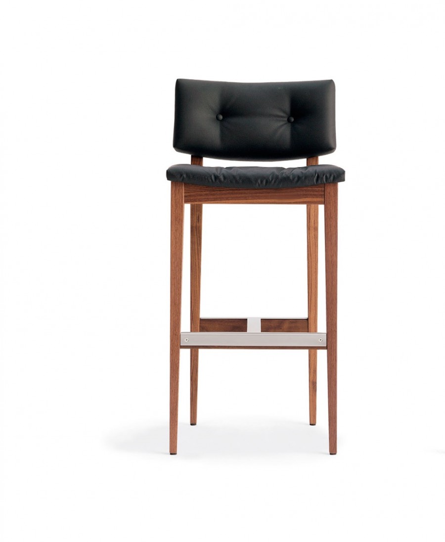 Eileen Gray Vintage Collection / Bar Height Stool / No Arms / Solid Beech Frame STD / Tapered Legs / Outerback Plywood to Match Frame / Wood Stain Finishes None Cost Option / Upcharge American Solid Walnut / Braced Footrest From Front To Back For Added Strength / Footrest in Mat Silver Metal / Fully Braced All Round For Heavy Contract Use / Fully Upholstered From Group 3 Fabric in Fabric, Vinyl or Leather / Button Seat & Back / Well Padded Seat & Back Fixed Cushion / Ideal For Boutique Hotels / Bar Areas