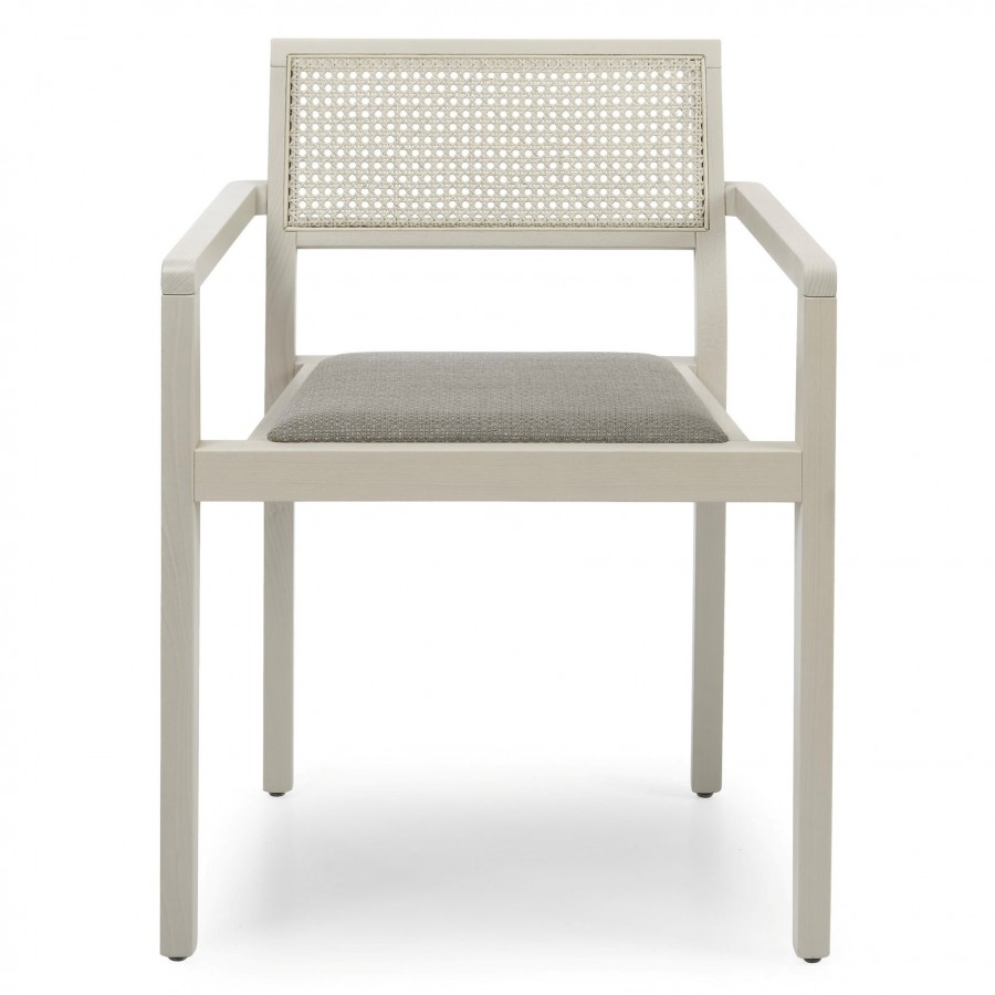 Gusto Armchair / Integrated arms / Beech frame standard / Tapered squared wooden legs / Upcharge for additional wood stain or colour finishes / Natural cane back or colour coordinated cane to match frame / Fully upholstered seat, upholstered in fabric, vinyl or leather / Ideal for all restaurants, coffee shops and retail environments.