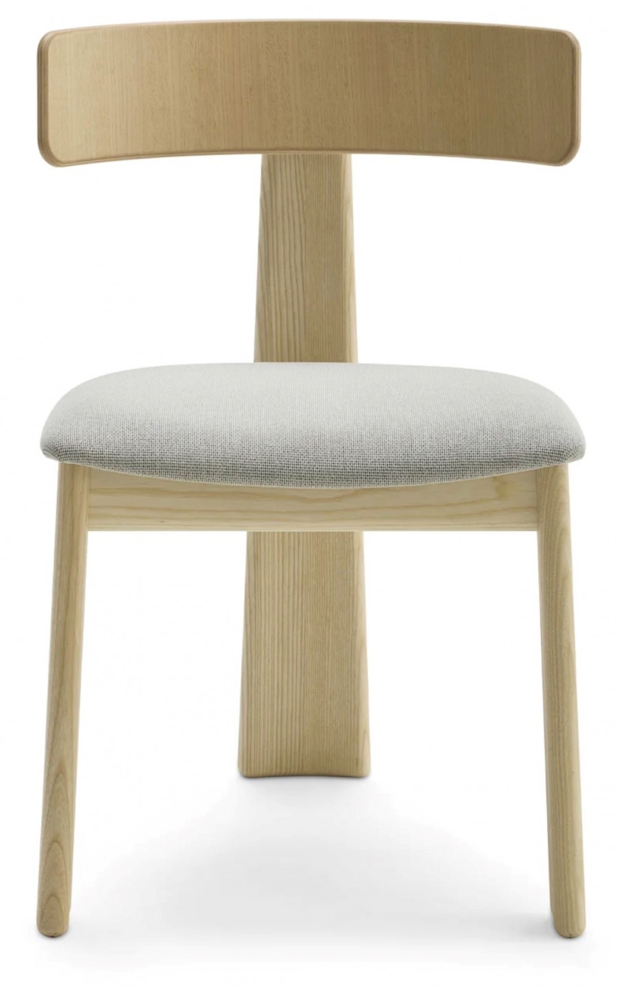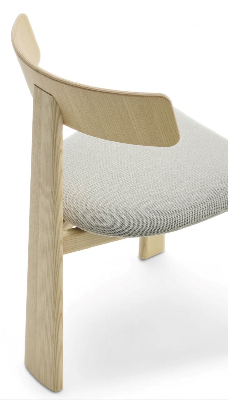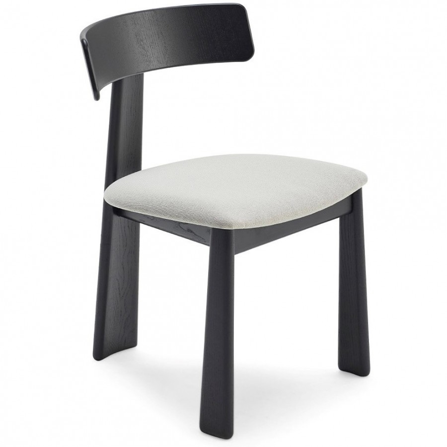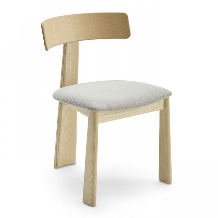 Troy Side Chair / Unique design with rear leg integrated into back / Natural ash wood frame standard / Upcharge for various wood stain finishes / Three tapered wooden legs / Curved back for added comfort / Braced all round for additional strength / On nylon glides / Seat can be upholstered in fabric, vinyl or leather / Ideal for restaurants, boutique hotels and retail use.
